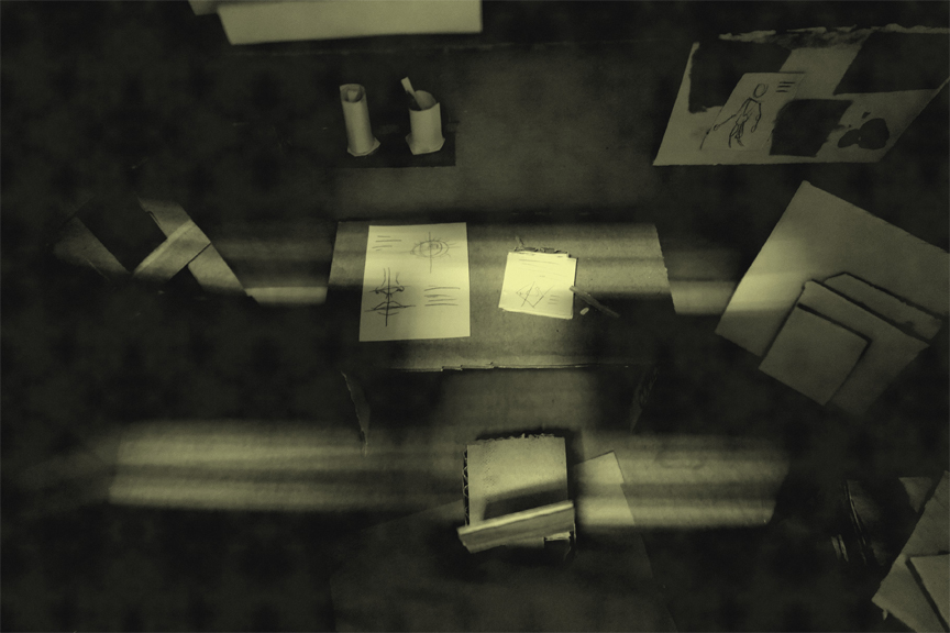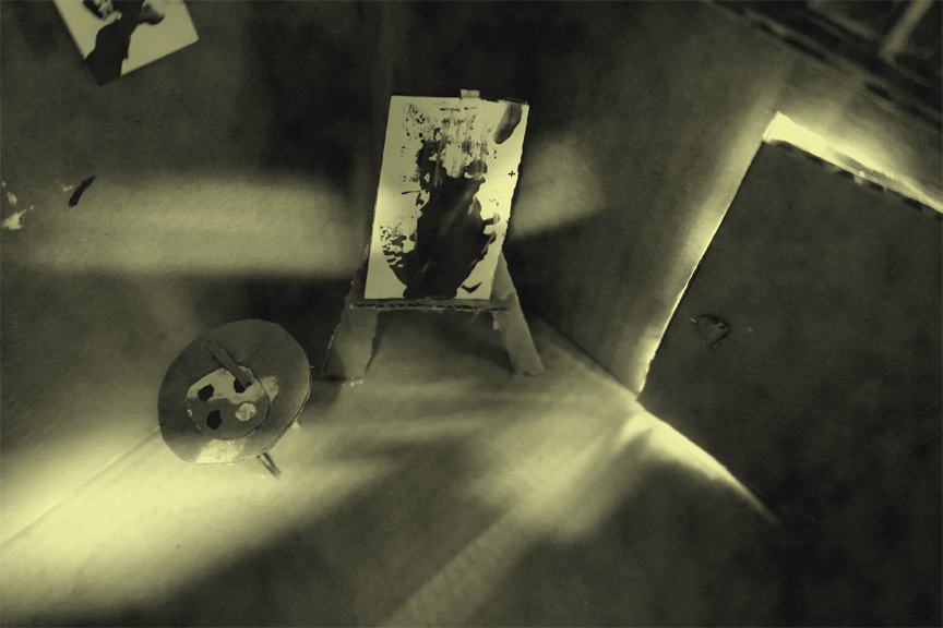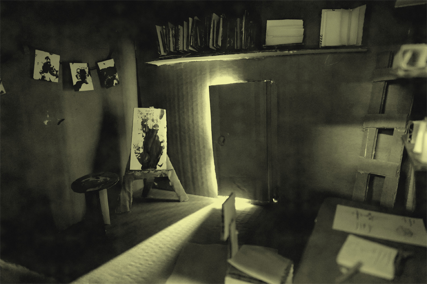 Première proposition J'ai souhaité représenter le bureau où l'artiste fait des recherches sur l'art, prend des notes qui lui seront utiles pour réaliser ses œuvres. Des toiles vierges sont disposées à droite, un tableau en liège où sont punaisées plusieurs fiches et croquis, des étagères avec divers matériaux à portée de mains, une échelle en bois est posée contre le mur gauche afin d’accéder au velux si besoin. Au centre, le bureau, avec des feuilles et un carnet, une chaise tournée vers le bureau sur un tapis. Des rayons de lumière provenant du velux forment de longues bandes claires à travers la pièce. Un filtre sépia qui a été ajouté, donne à la photo une ambiance sombre, mélancolique, une sensation de vide, perturbante.