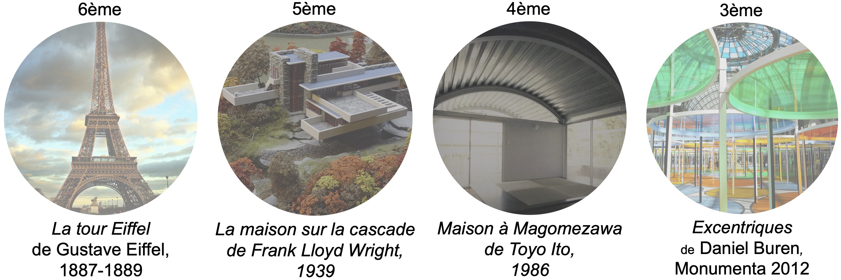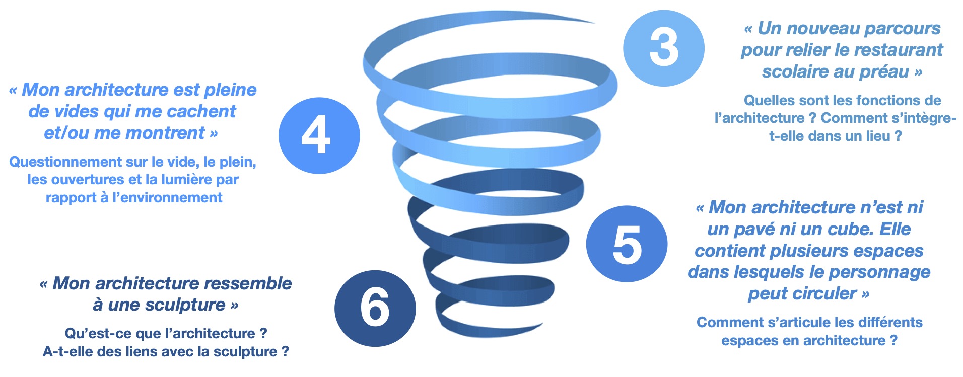 Sur les questions d’architecture en lien avec la sculpture, la culture artistique se construit autour de références inscrites dans une dynamique spiralaire. Les élèves ont donc en mémoire au fil des années les œuvres comme :
