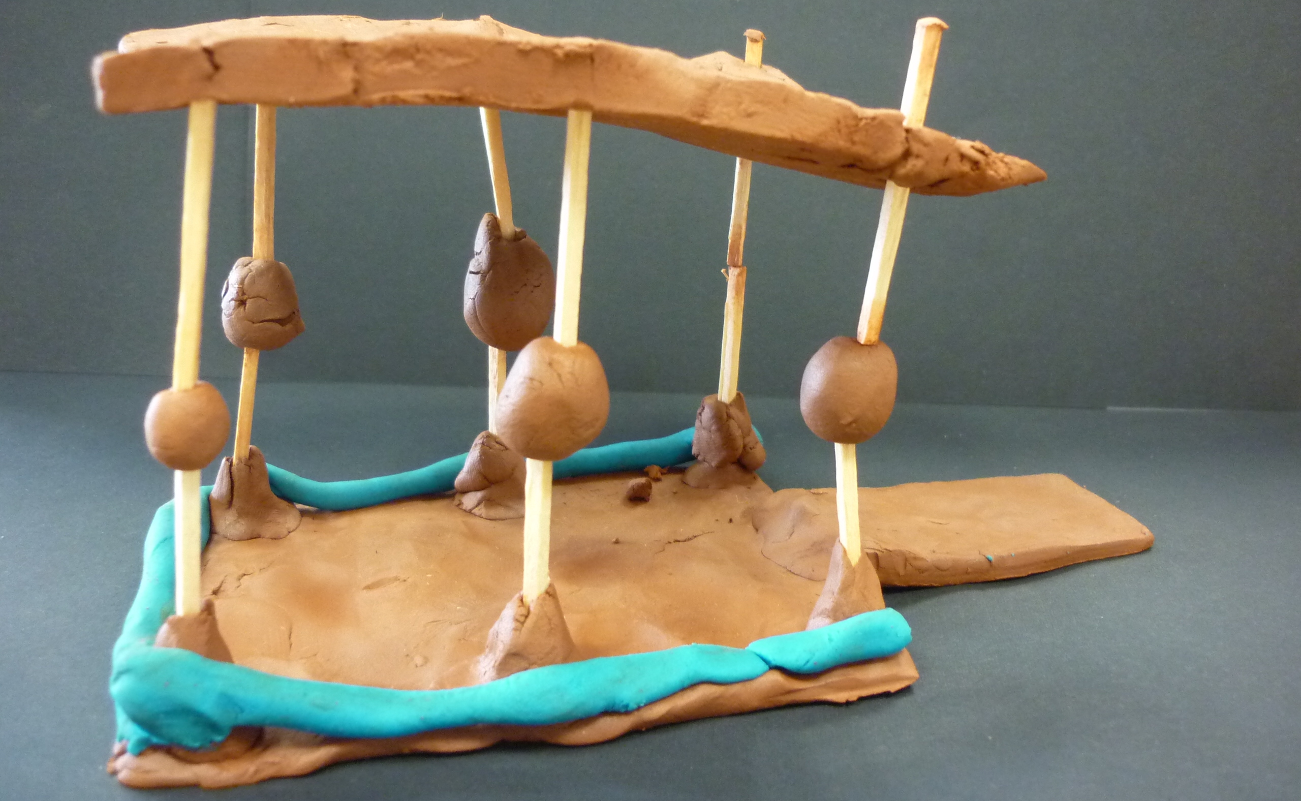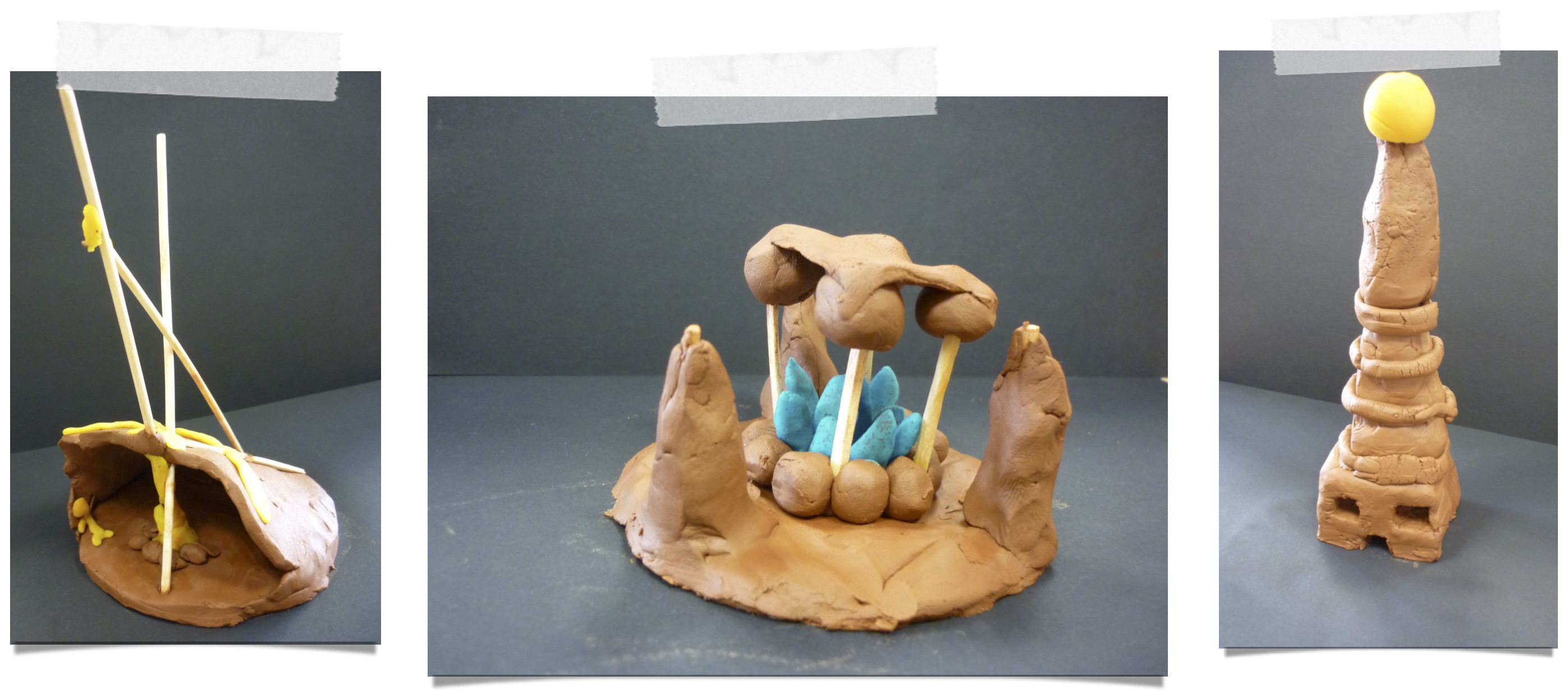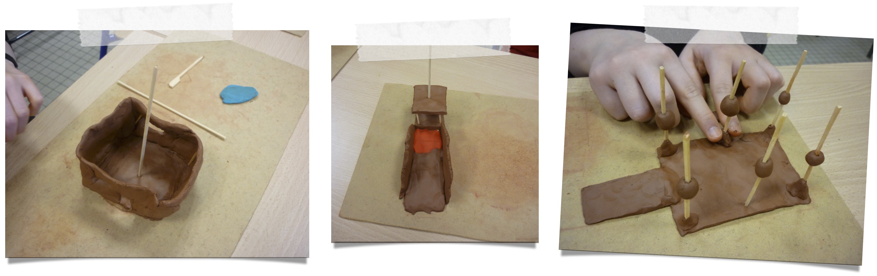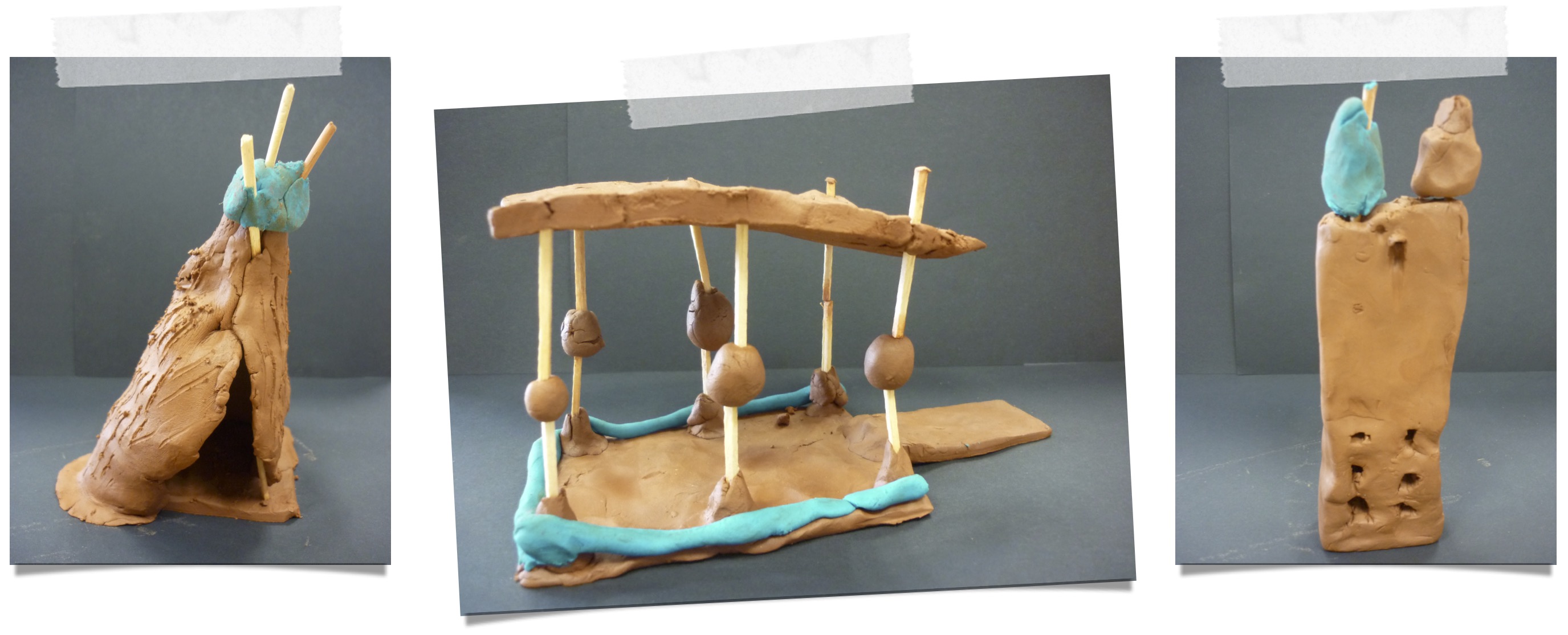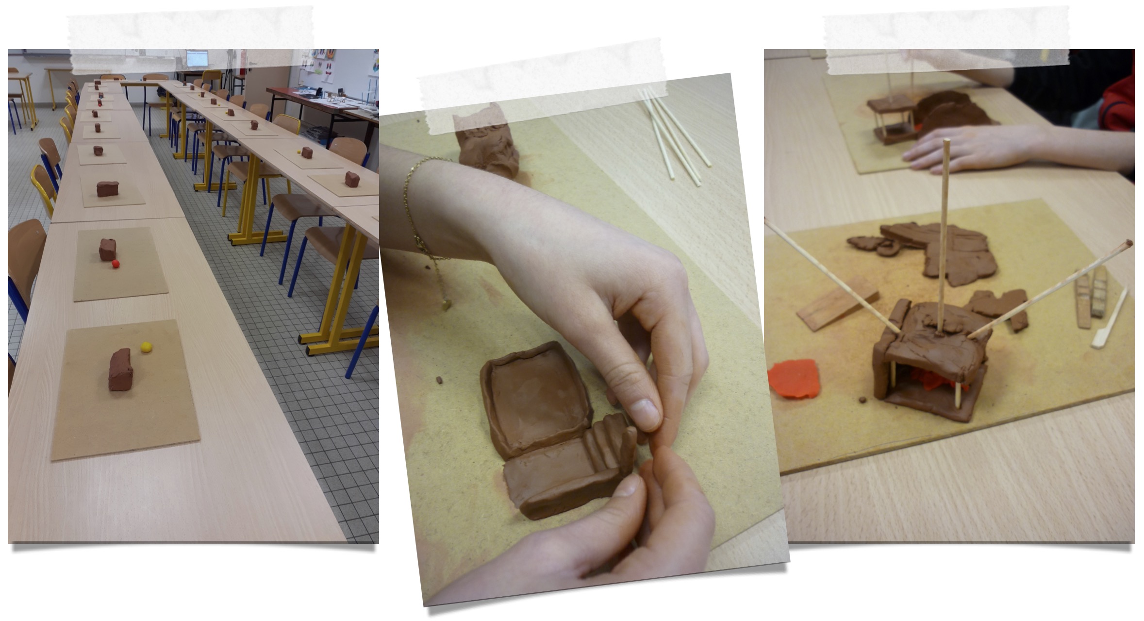 Chaque élève dispose d’un petit pavé de terre crue, une toute petite boule de pâte à modeler de couleur, 3 ou 4 petits bâtonnets de bois (allumettes), 3 ou 4 pics en bois ainsi qu’un outil.