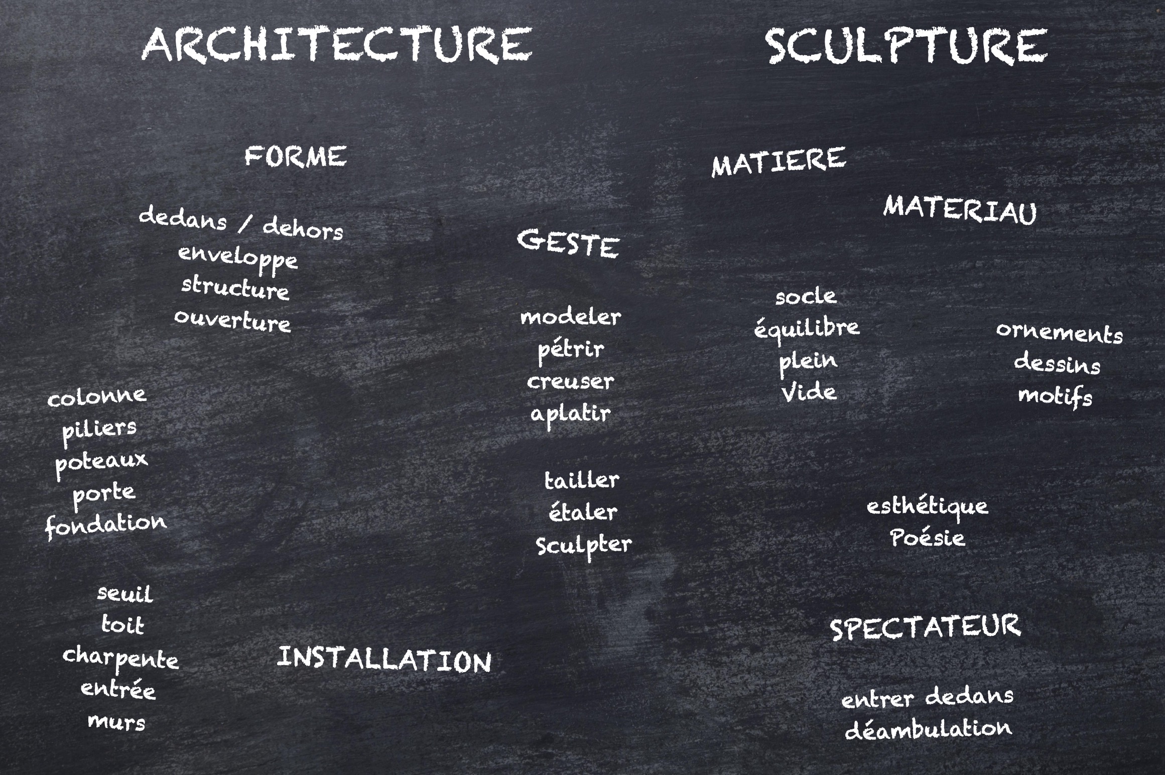Pour essayer de synthétiser les échanges, la question suivante est posée en axant le regard sur quelques productions : s’agit-il de sculpture ou d'architecture ? Quels points communs peut-on trouver à la sculpture et à l'architecture ? Comment distinguer, si besoin, les deux ? Quels seraient le vocabulaire commun (notions, questions…) à l’architecture et à la sculpture ?