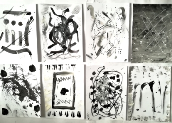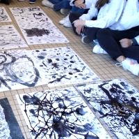 Au bout des six minutes, nous faisons une première mise en commun. Ce que les élèves ont travaillé : ils ont exploré le mélange des matières en utilisant les possibilités des outils. Ils parlent de matérialité, d'outils, de gestes et d'abstraction. |