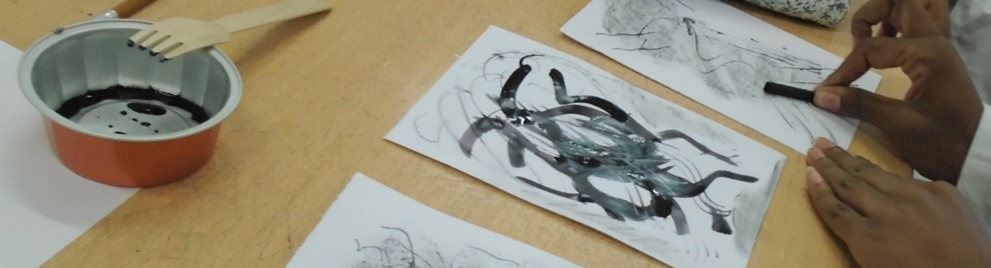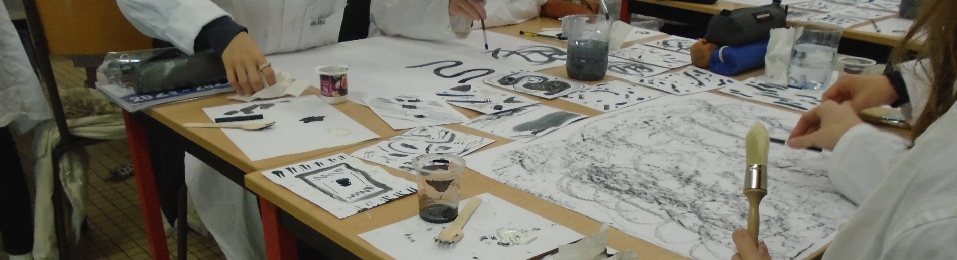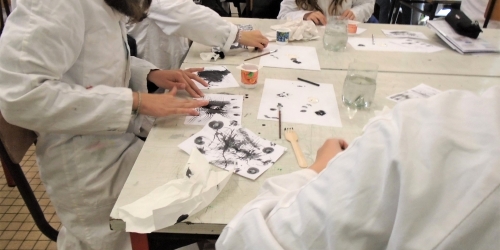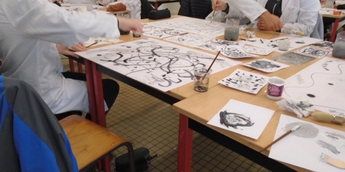Je leur indique dans un premier temps que j'ai mis à disposition au fond de la salle, en plus de ce qu'ils ont déjà, les pots de peinture blanche et de peinture noire, celui d'encre de chine, la boîte de fusain et des brosses plus larges. Je donne à chaque groupe un support format raisin.