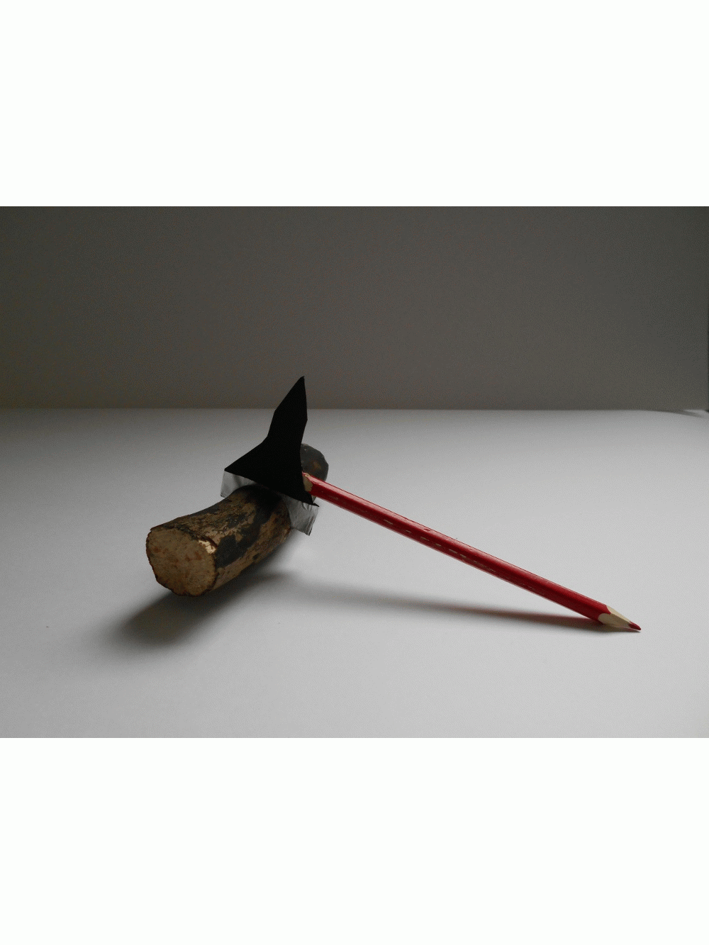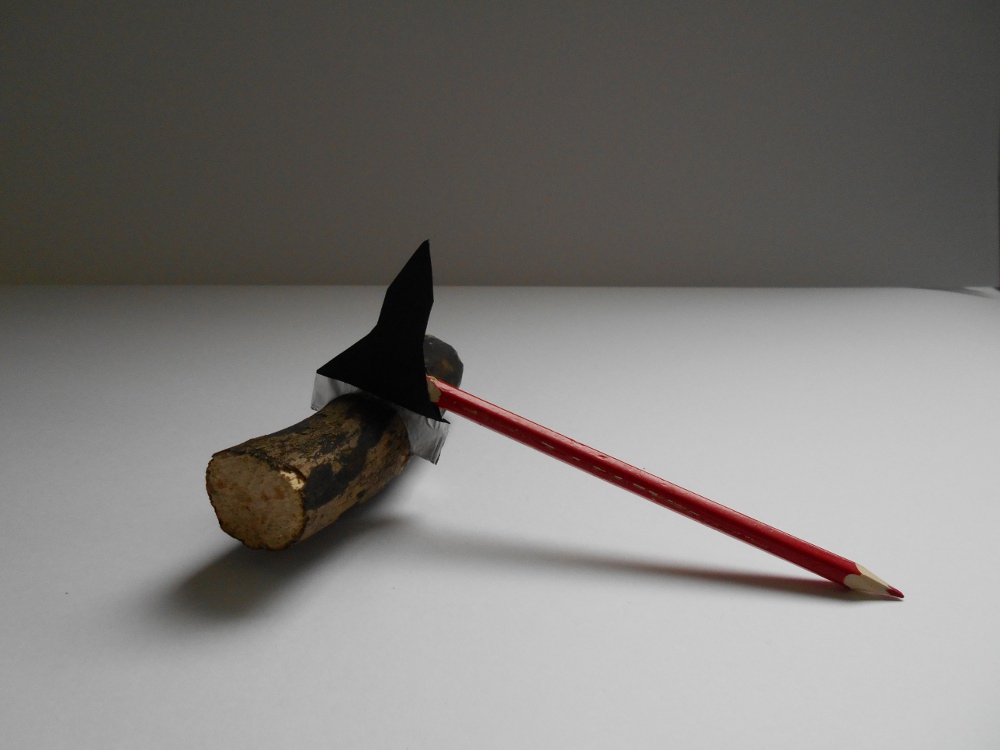 Un morceau de bois brut est scié et permet à la hache en papier de se maintenir en équilibre.