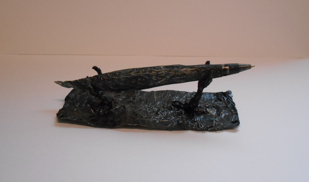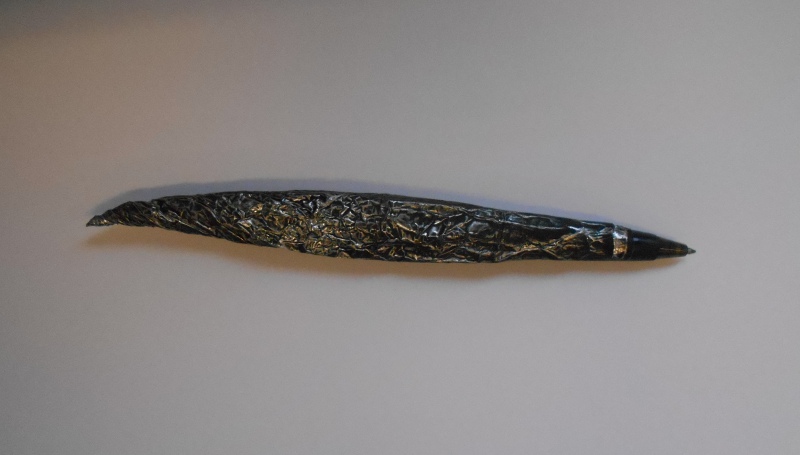 Ce stylo est entièrement faconné dans du papier aluminium autour d'une cartouche de stylo à bille de couleur noire.