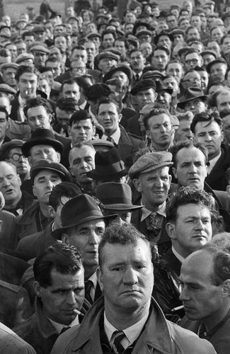 De cette photographie, je retiens d’abord l’impression de masse, d’un espace qui sature, d’une présence répétée. Il y a tellement d’individus qu’ils deviennent un tout, sans aucune individualité. La superposition des plans permet de créer un espace, une profondeur qui prend forme grâce à l’accumulation des corps.