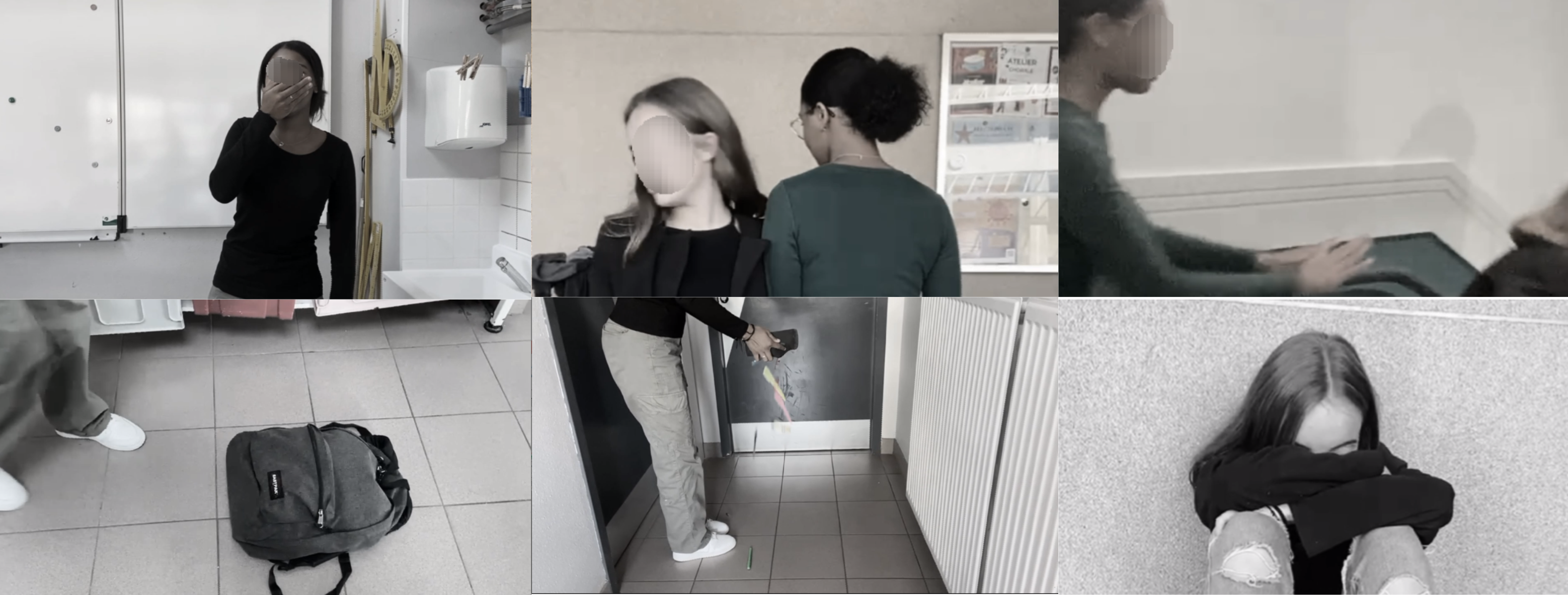 Deux élèves jouent différentes scènes de harcèlement scolaire, la troisième filme. Le manque d'empathie, l'absence de l'intervention de témoins et la répétition des actes sont mis en évidence.
