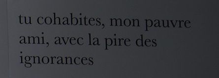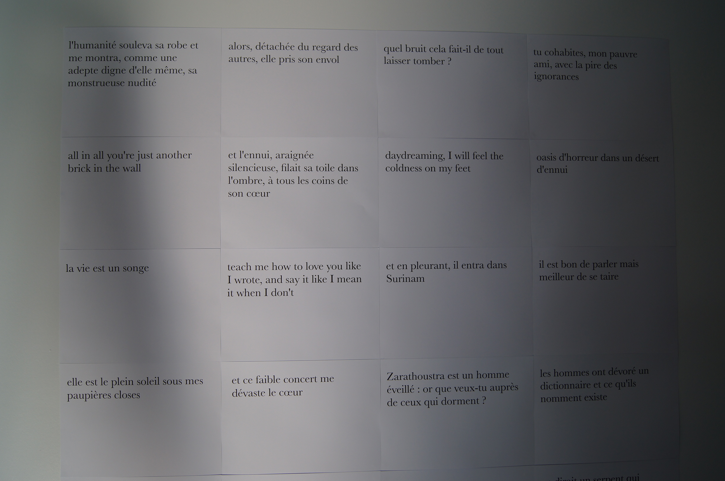 Pauline répond ici à la proposition en conservant surtout l'idée d'utiliser des fragments. Elle vagabonde dans ses lectures, les souvenirs de ses lectures, et capte avec une raison personnelle qui reste énigmatique. Le jeu avec les mots est littéraire et plastique.