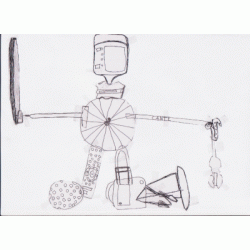 L'élève doit donc réaliser ce personnage tout en prenant en compte le premier objet scotché "n'importe où" sur sa feuille; Il déterminera d'ailleurs la position du futur personnage sur l'espace de feuille mais également sa posture.