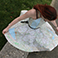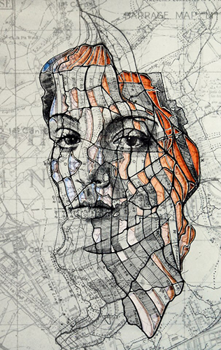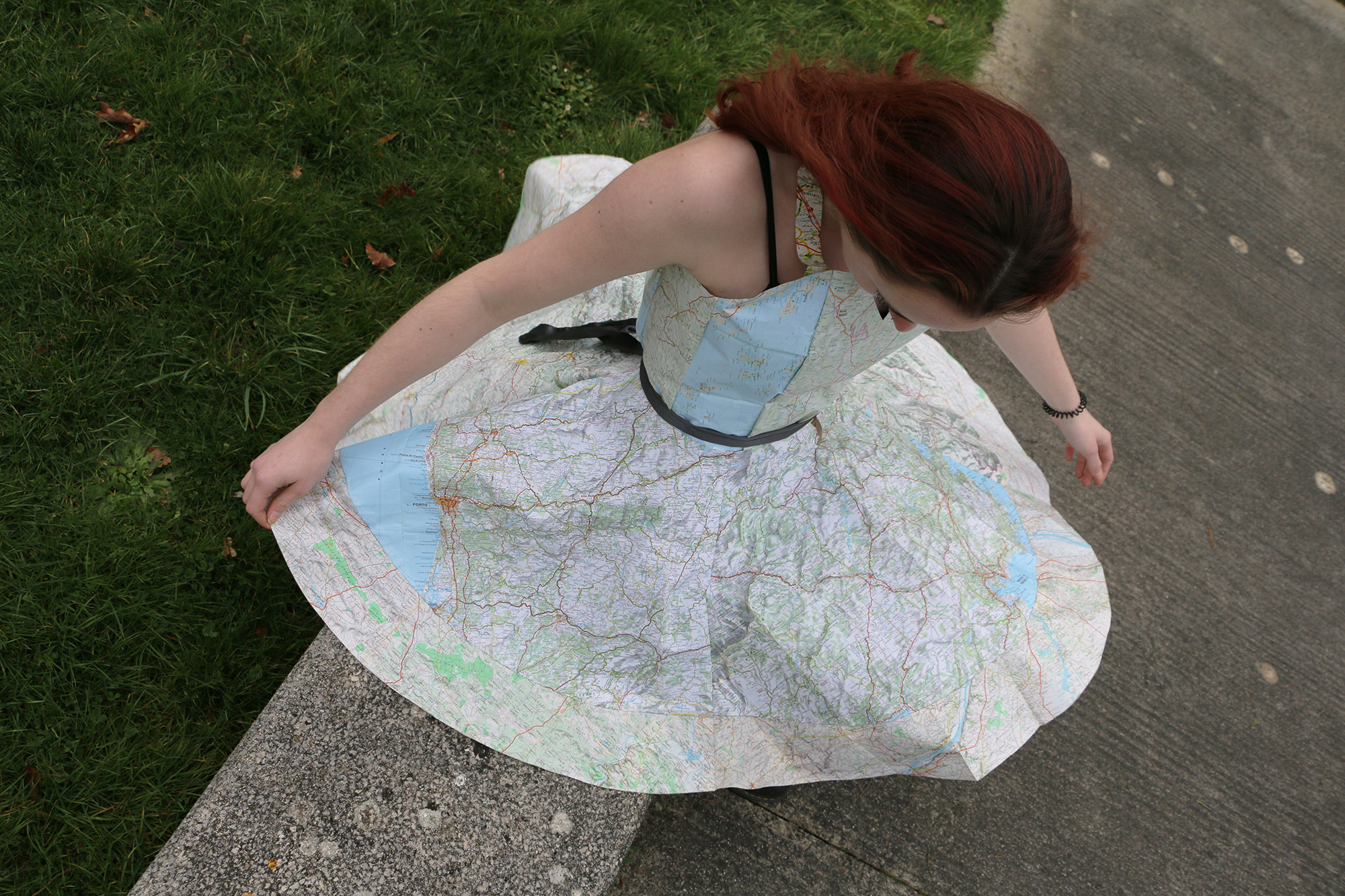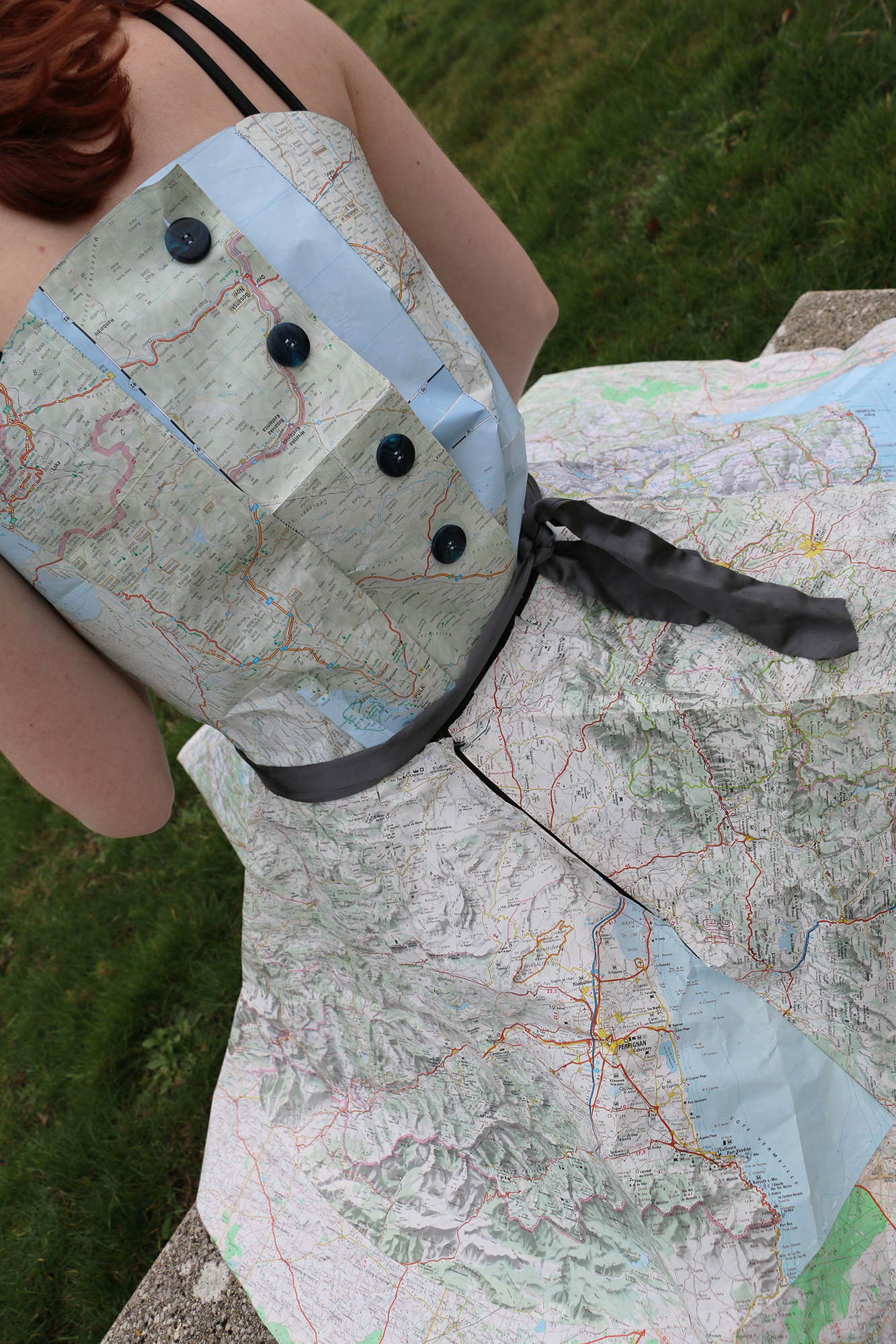 L'une a choisi un document trouvé sur Pinterest (une pin up dans le style années 50), l'autre dans un article posté par Emmeran Richard (un dessin sur carte géographique d'Ed Fairburn). Pour nouer ces deux approches, nous avons décidé de créer une robe qui serait uniquement faite de papier cartographique. Il fallait pour cela trouver le patron d'une robe imitant celles portées dans les années 1950. Après avoir découpé les pièces du bustier et de la jupe selon nos mesures et comme indiqué sur le modèle, nous nous sommes réparties les tâches d'assemblage et de couture, intégrant fermeture éclair et boutonnière afin que quelqu'un puisse éventuellement porter cette robe. Le métissage de nos images et de nos pratiques a trouvé un prolongement dans l'utilisation de cartes provenant elles-mêmes de différents pays. Nous nous sommes entraidées tout au long de l'exécution de ce projet en nous appuyant sur les points forts de chacune, et avons trouvé ce travail très enrichissant car mêlant diverses techniques artistiques (dessin, sculpture, photographie) et artisanales (couture).