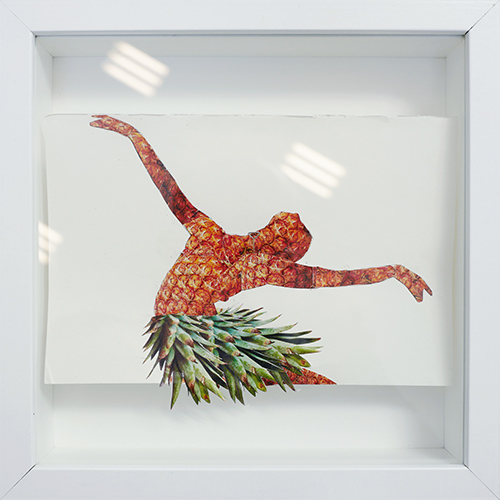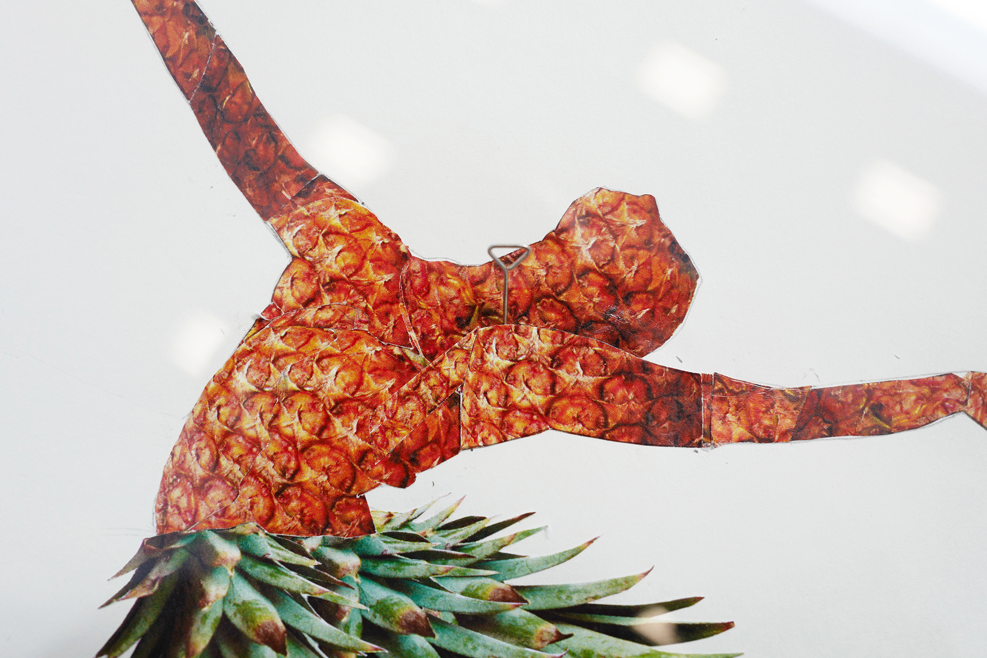 Notre petit collage, qui tient juste par une épingle, fait se rencontrer l'image sans grand intérêt d'un fruit exotique et celle plus élégante d'une danseuse classique. Deux images trouvées plus ou moins par hasard sur Internet. Nous avons décidé d'assembler ces deux « objets » de manière à ce qu'ils fassent « corps ». Notre ballerine se pare aux couleurs de l'ananas qui, en retour, révèle ses courbes. Cette relation entre une danseuse et un fruit n'est pas sans rappeler la fameuse Danse des bananes (1925-26) au cours de laquelle Joséphine Baker dansait le charleston à peine vêtue de quelques fausses bananes qui lui ceinturaient la taille, une danse dont le scandale fit à l'époque rapidement place à l'engouement général.