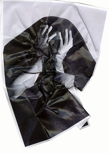 2) une image tout à fait inhabituelle de Marilyn Monroe, prise par le photographe de mode Andre de Dienes en 1946 : Marilyn shows what death looks like. Nous avons découvert cette étrange photographie dans l'exposition d'Agnès b. au Musée National de l'Histoire de l'Immigration : « Vivre !! 70 œuvres choisies dans ma collection ». De manière à nous approprier cette image, un tirage d'imprimante a simplement été froissé puis scanné avant d'être ré-imprimé.