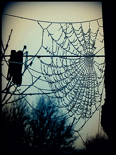 1) une photographie personnelle que l'une d'entre nous a prise l'hiver dernier représentant une toile d'araignée (donc en lien direct avec la notion de tissage), et qui a été retouchée à l'aide d'une application pour smartphone (Photo editor) ;