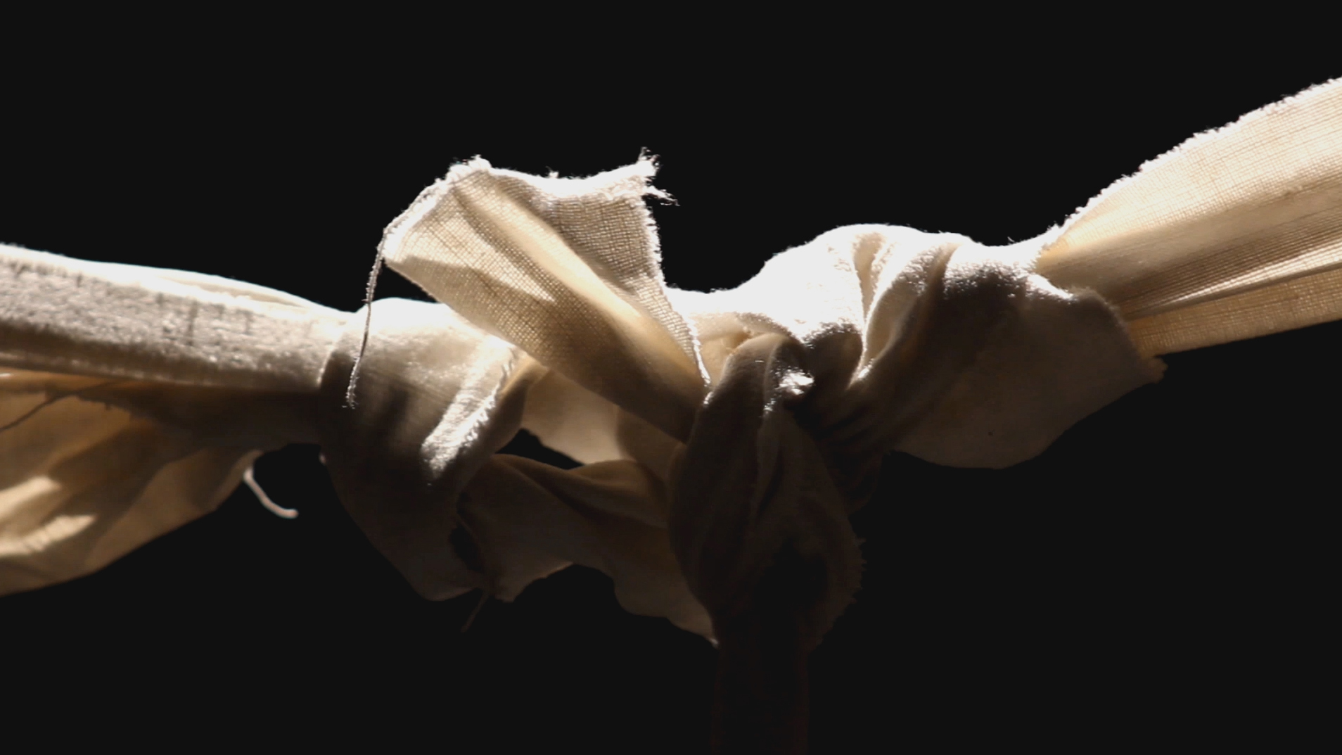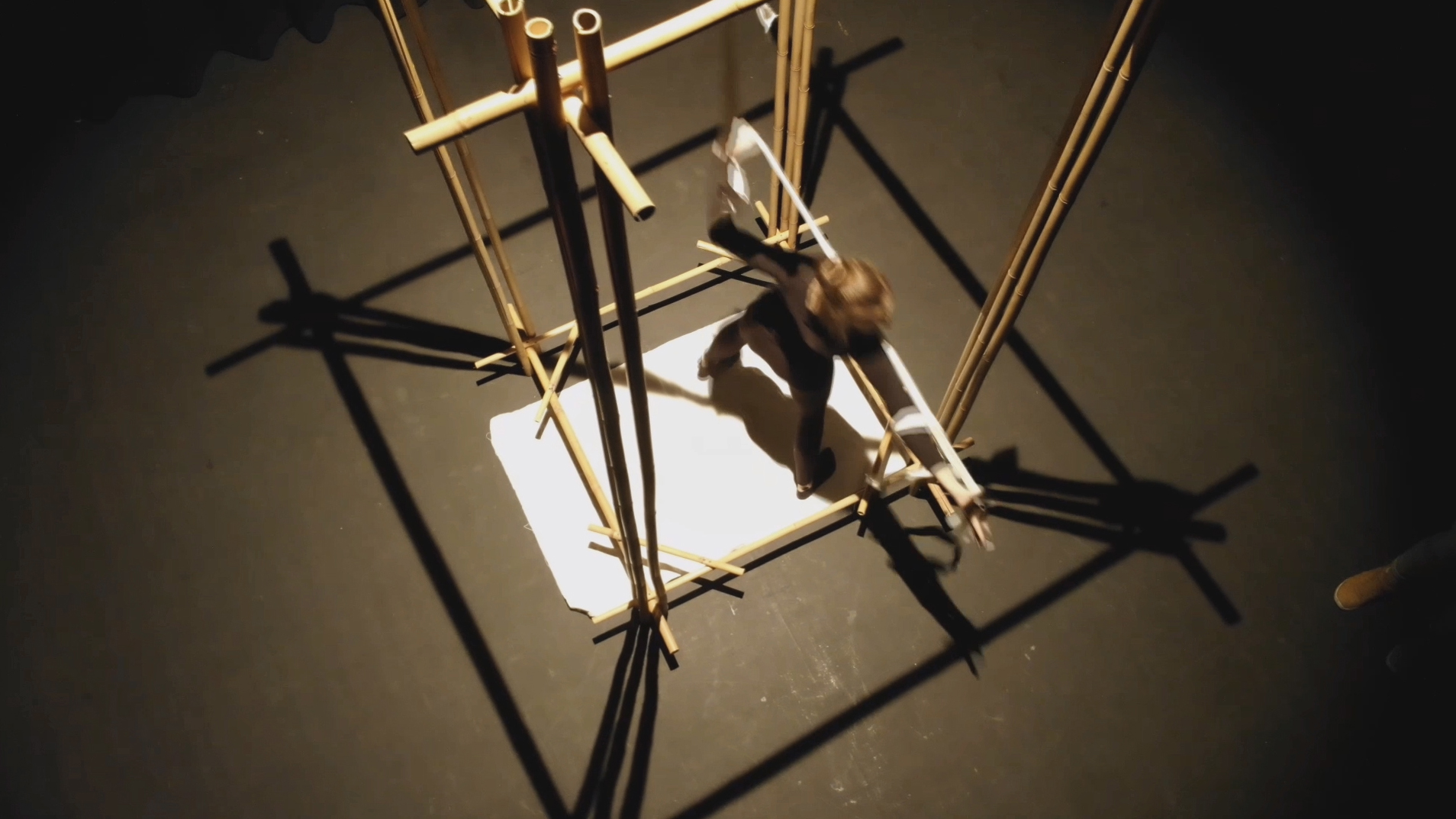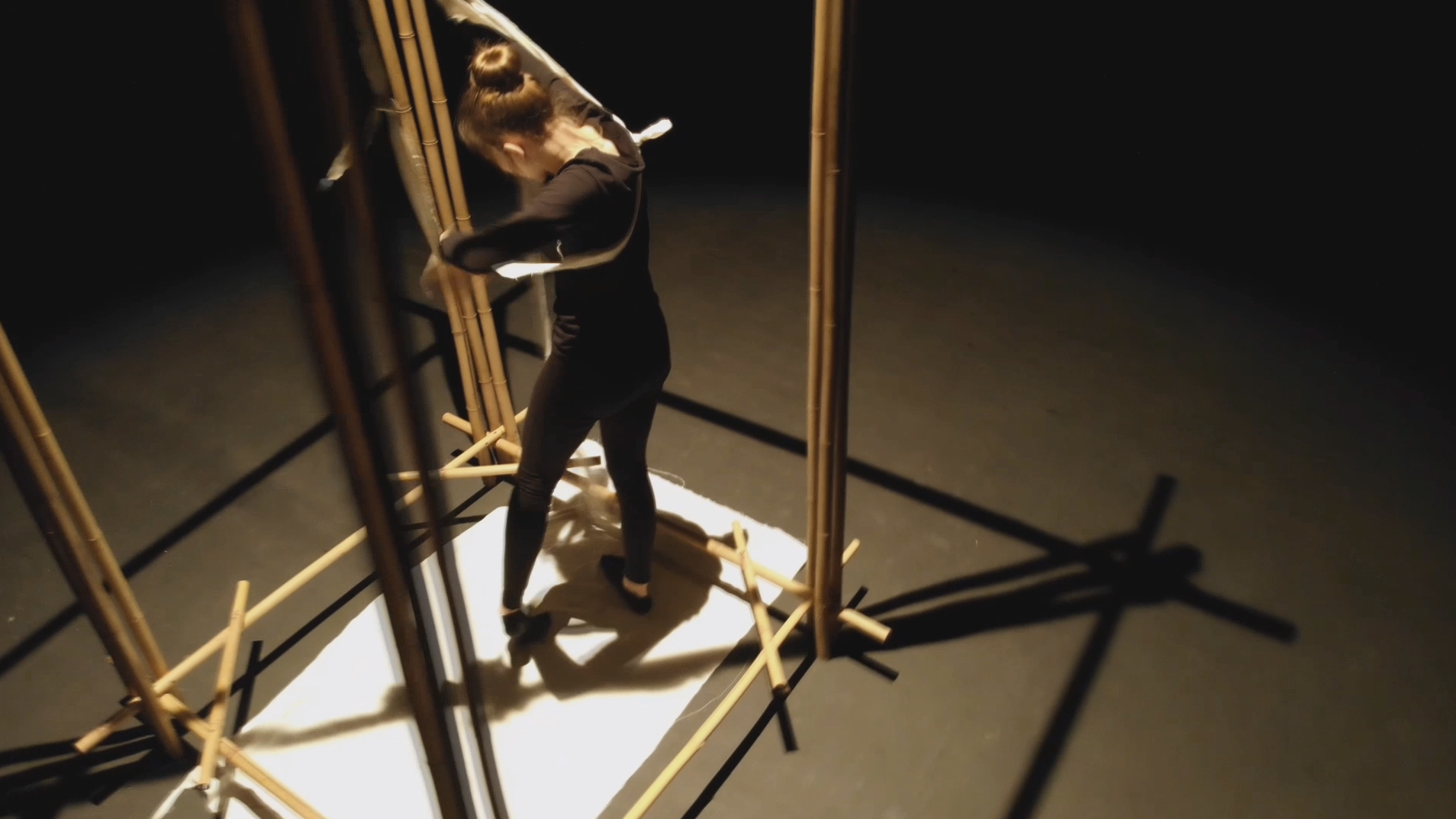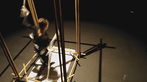 Généralement, la sculpture est un art plutôt figé. Ici, le volume, qui se résume à une structure faite de bambous, s'accompagne parfois de légers mouvements de bascule, témoignant de sa fragilité. Mais cette sculpture existe surtout pour mettre en valeur les mouvements du corps, qui est devenu une "sculpture vivante". La structure fixe et le corps mouvant sont reliés entre eux par un troisième élément : un tissu blanc, semblable à ceux utilisés dans les ateliers pour recouvrir l'argile en cours de modelage.