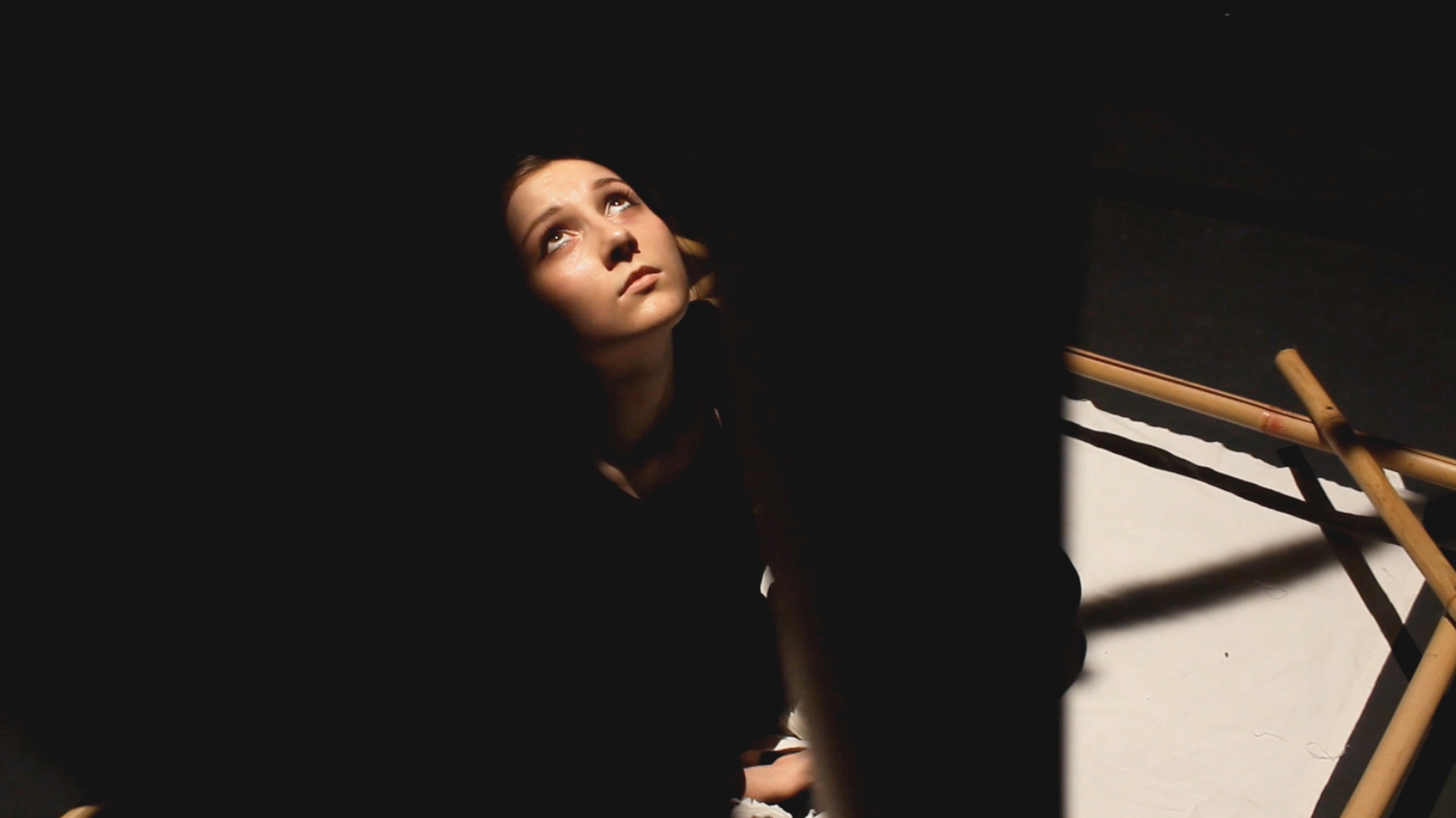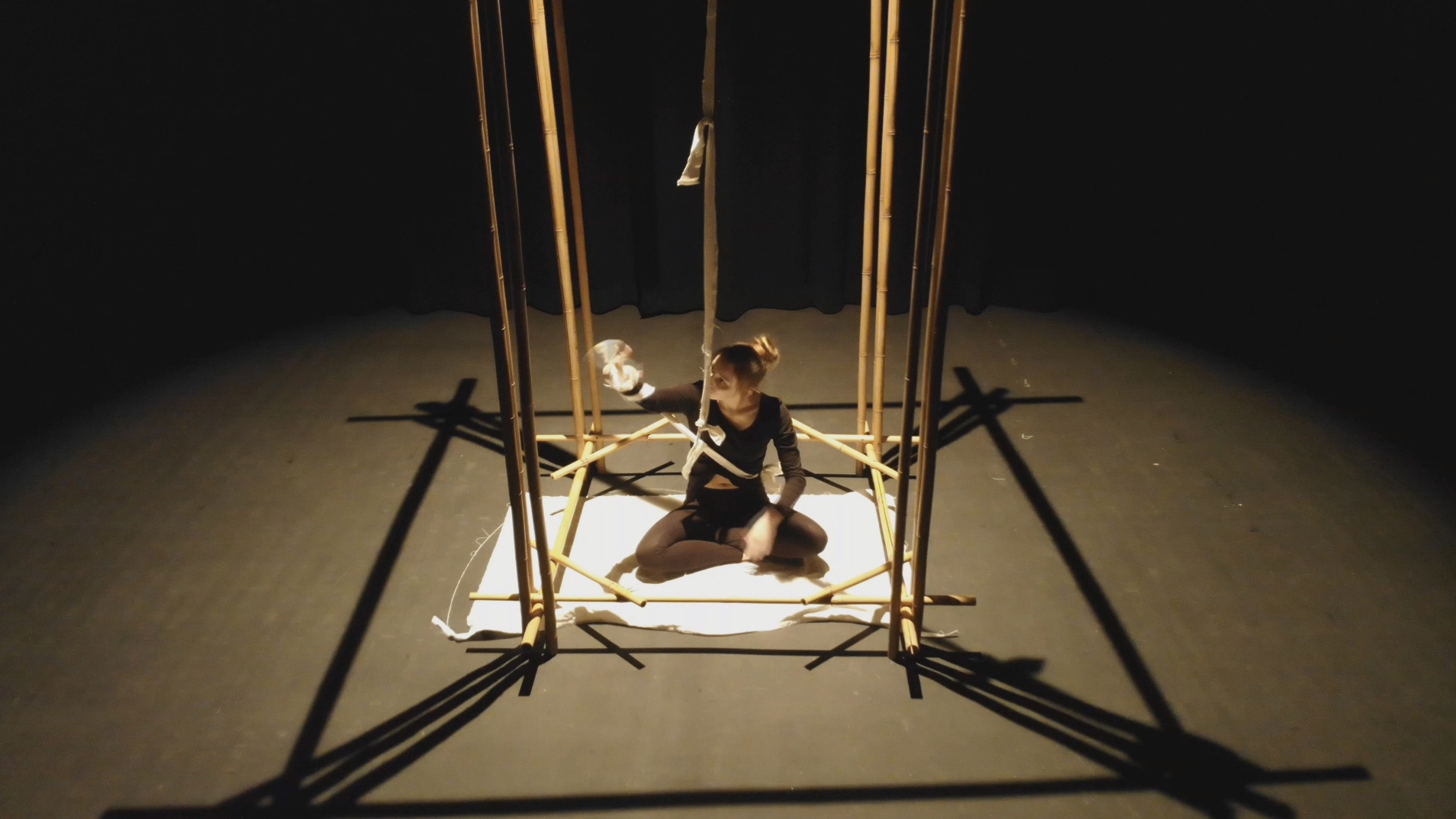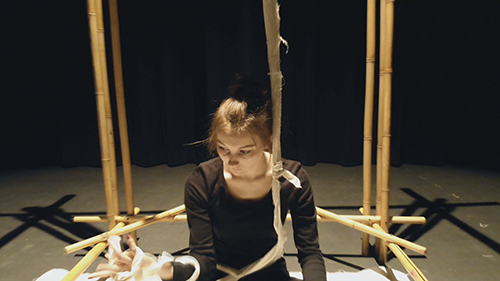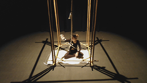 Ce travail dans lequel cohabitent la scène et les arts plastiques résulte d'une collaboration avec une amie pratiquant les arts du spectacle dans un lycée nantais. Ensemble, nous avons imaginé un dispositif sculptural, une sorte d'ossature facilitant le jeu corporel et la mise en situation d'une action. Pour des raisons techniques, notre binôme a été rejoint plus tard par deux régisseurs lumière, un chef-décorateur, et même le pilote d'un drone ! Malgré des directives précises, chacun d'eux a d'ailleurs mis en avant des suggestions qui ont influencé le projet initial. D'autres séquences vidéo, montées en amorce de la performance filmée proprement dite, ont été possibles grâce à la participation complice de certaines camarades de classe.