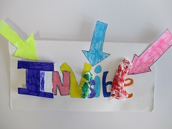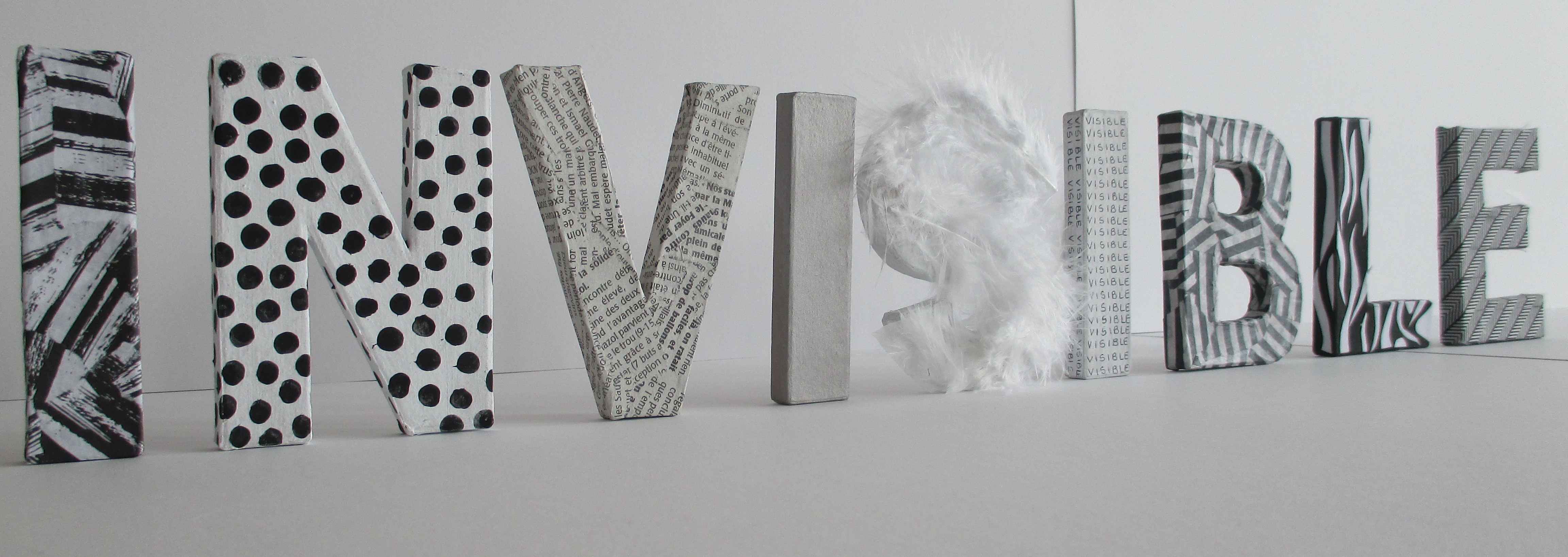 "J'ai cherché un mot qui pouvait incarner le décalage entre le sens du mot et sa présence dans mon travail. Rapidement le mot « invisible » m'a paru parfait pour mon travail. J'en ai fait l'élément unique de ma production. J'ai eu recours à la mise en volume de certaines lettres et aux couleurs vives, aux flèches pour attirer le spectateur et le confronter au paradoxe de mon travail. Un Invisible très visible !"