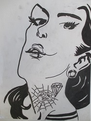 "Je ne voulais pas que les mots semblent ajoutés à ma production. Je voulais qu'ils soient intégrés. J'ai eu l'idée du tatouage. J'ai alors représenté une femme avec des tatouages dont l'un indique « No tatoo ». Le texte ne ressort pas particulièrement. Ce n'est que dans un second temps que le spectateur est confronté au décalage entre ce qu'il voit et ce qu'il lit."