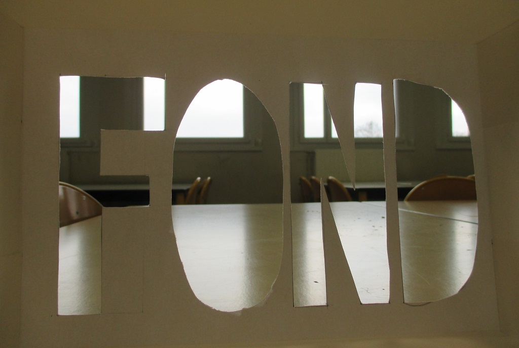 "J'ai réalisé une boite en papier. J'ai écrit au fond de cette boite le mot FOND en évidant les lettres. Le fond devient alors une ouverture. Il y a un décalage entre le sens du mot et ce que nous voyons, le fond n'est plus vraiment le fond de ma boite. La présence des lettres est aussi un vide dans mon travail."