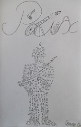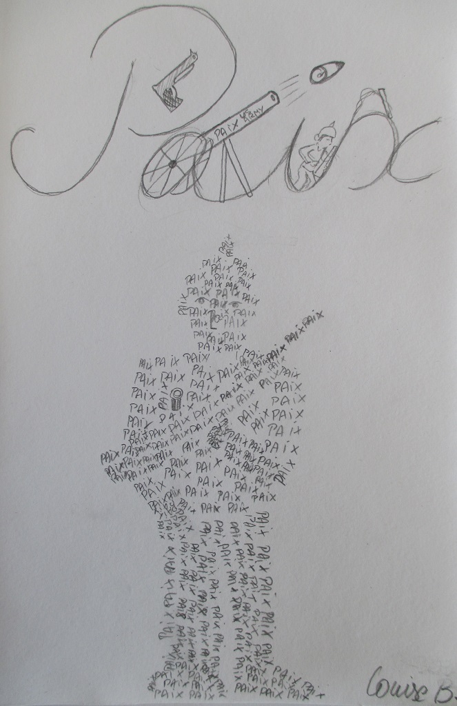 "La proposition m'a fait penser au décalage qu'il y a parfois entre les idées et la réalité. Comme je ne voulais pas faire un dessin avec le texte en légende, j'ai eu l'idée de dessiner avec les mots. On avait fait des calligrammes en français, alors j'ai refait un peu pareil mais en gardant qu'un seul mot : Paix. Le spectateur lit le mot plein de fois, dans tous les sens, avec différentes écritures. Mais il voit la silhouette d'un soldat."