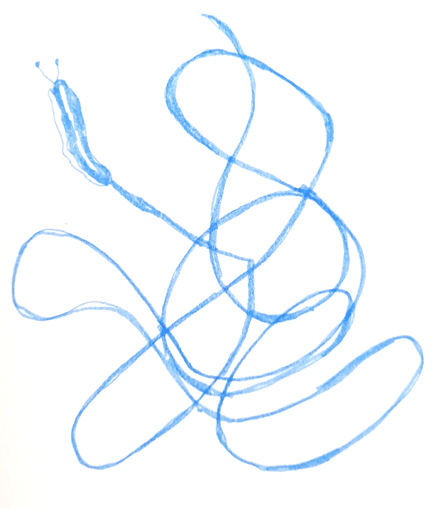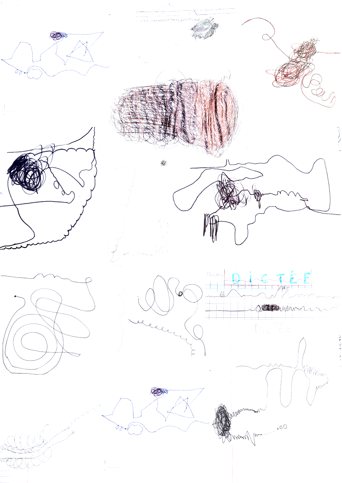 Un texte est lu en classe, il s'agit d'une histoire de ligne, qui traverse différents événements, diverses émotions. Pendant la lecture, mise en scène à la manière d'une dictée -préparation d'une copie à carreaux pour support, jeu des intonations et de la ponctuation- les élèves tracent, sur une feuille de classeur, la ligne au feutre noir narratrice du texte. La dictée est détournée, elle est purement graphique. On apprend une première fois, aux élèves, la racine de ce terme, qui signifie que lorsqu'ils écrivent, ils dessinent aussi, des lettres. L'écriture est un dessin.