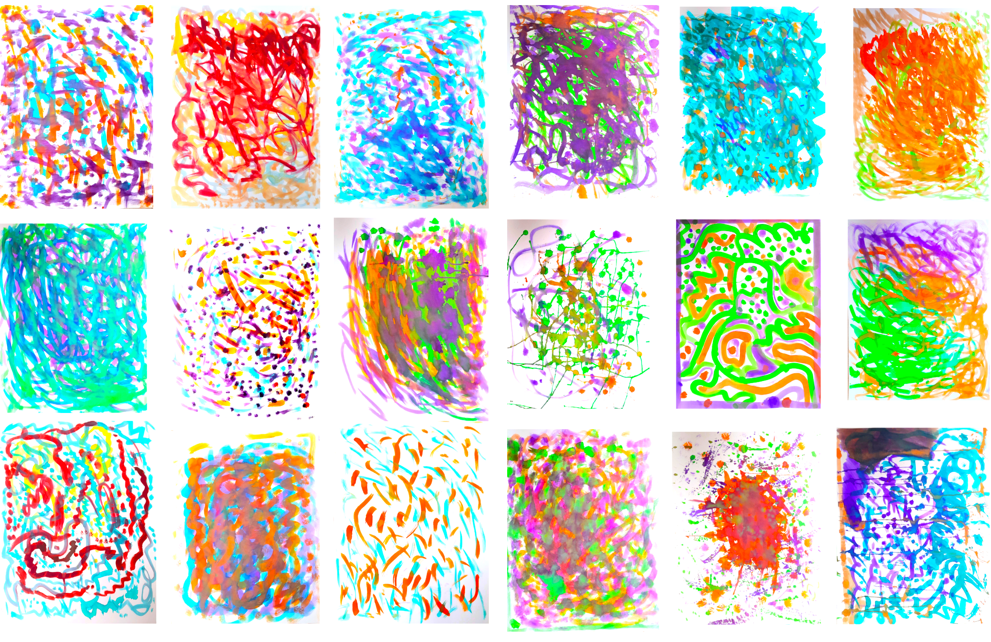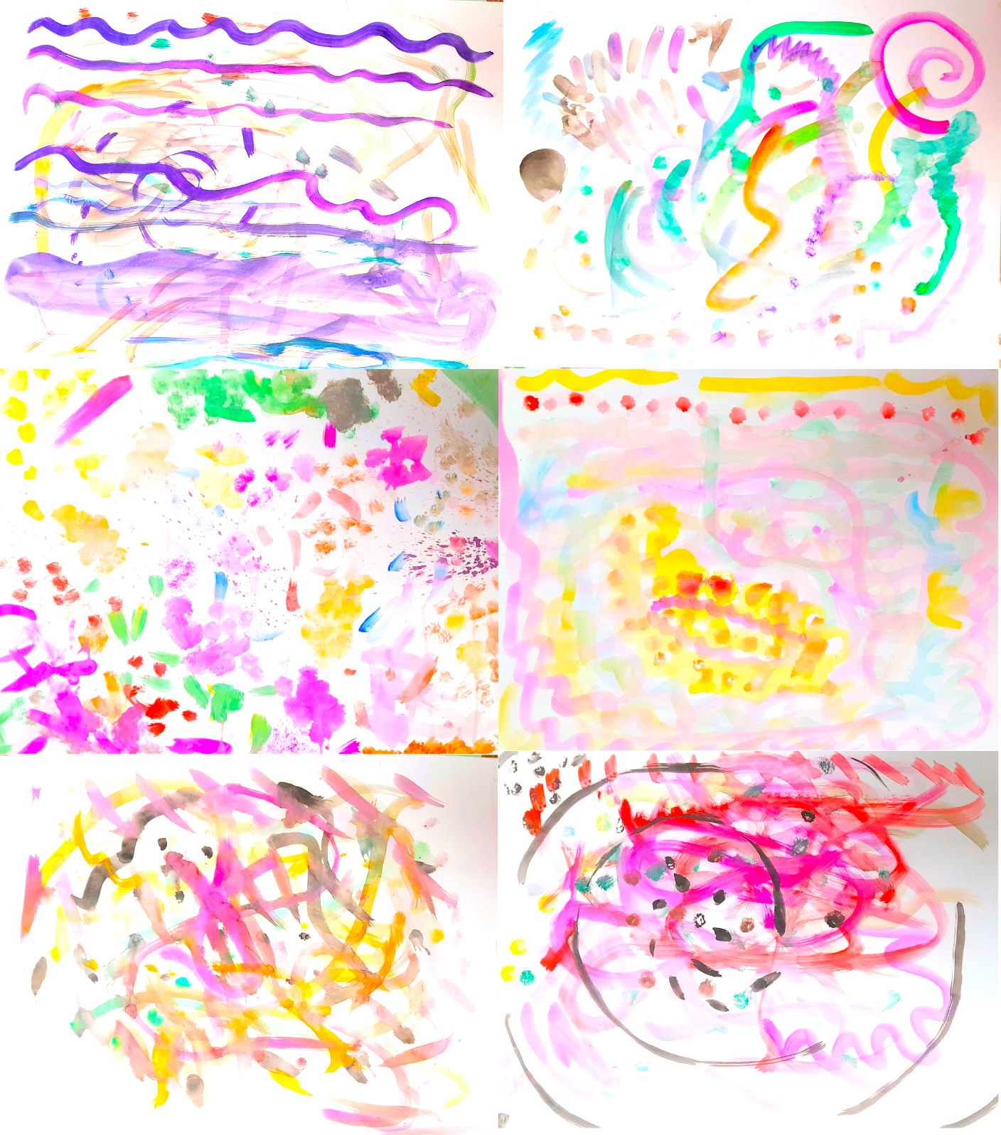 Sur un grand format - ici format raisin, avec de la peinture, les élèves sont amenés à danser. Ils sont debout, un outil à la main, et écoutent de la musique. J'ai choisi un morceau joué par des musiciens burkinabès sur plusieurs balafons. Il n'y a pas de paroles. Le rythme est soutenu, entraînant. Grâce à la peinture, les élèves laissent des traces de leurs mouvements, marquent le rythme, choisissent souvent différentes couleurs vives et rencontrent spontanément l'abstraction. Ils disent eux-mêmes, lors de la verbalisation, qu'ils se sont sentis libres, qu'ils n'ont pas eu à réfléchir, ou plus exactement que c'est leur corps qui a réfléchi.