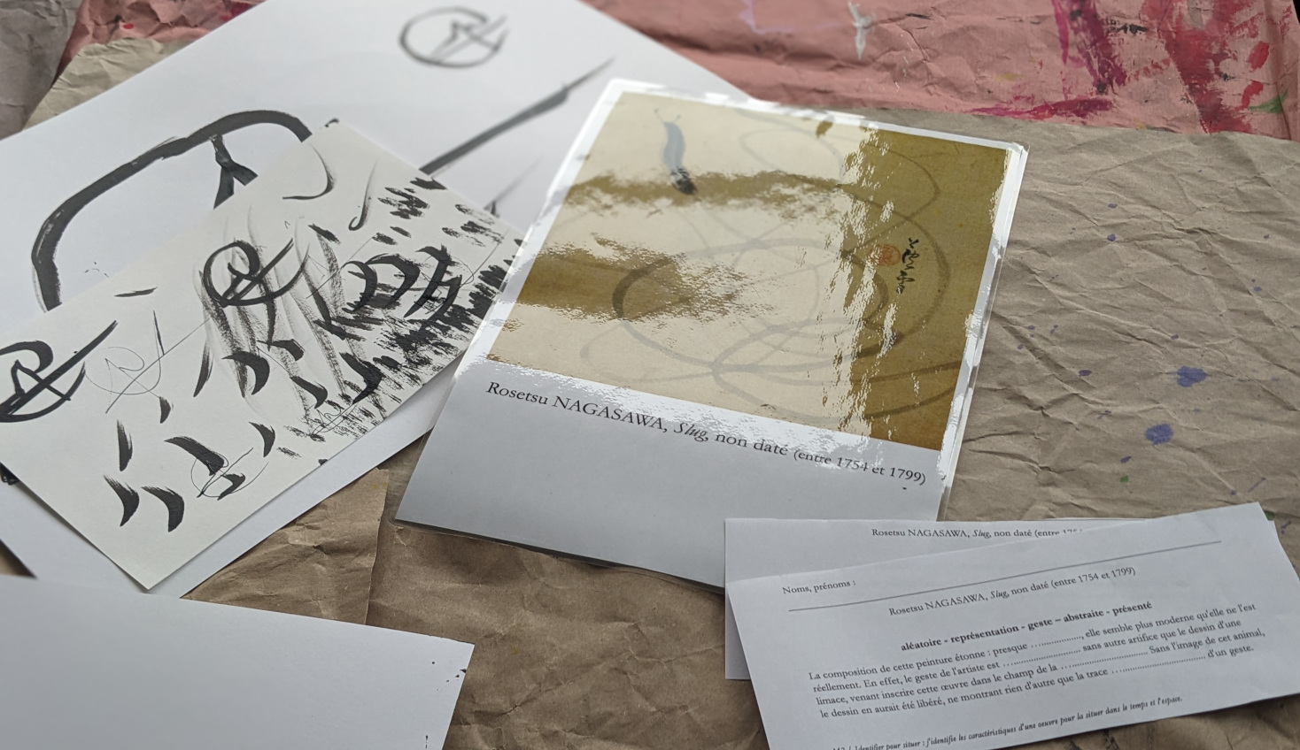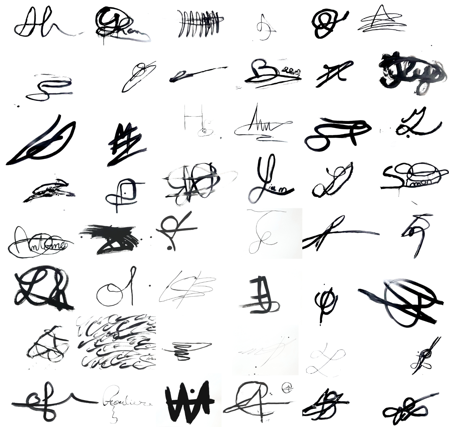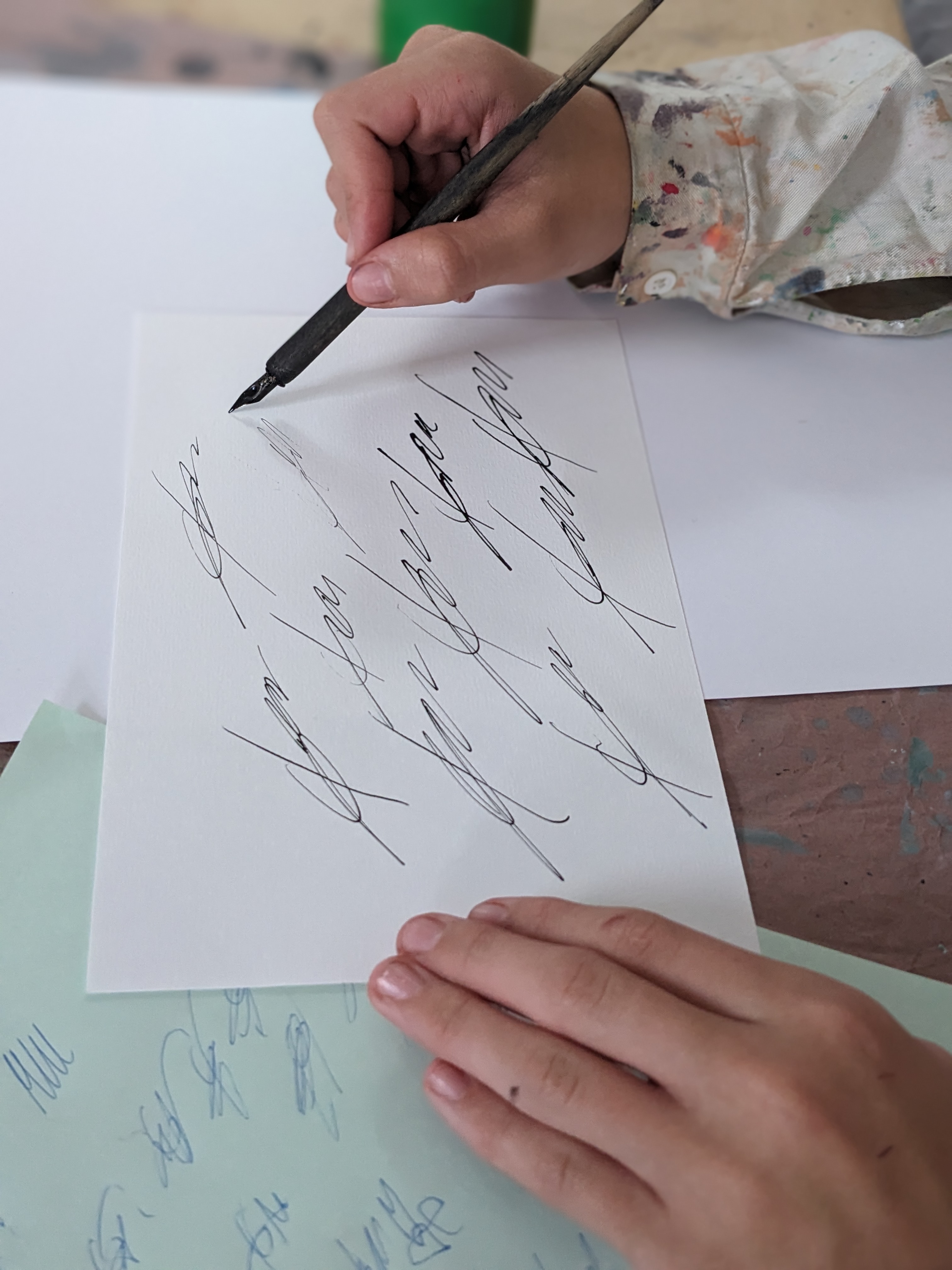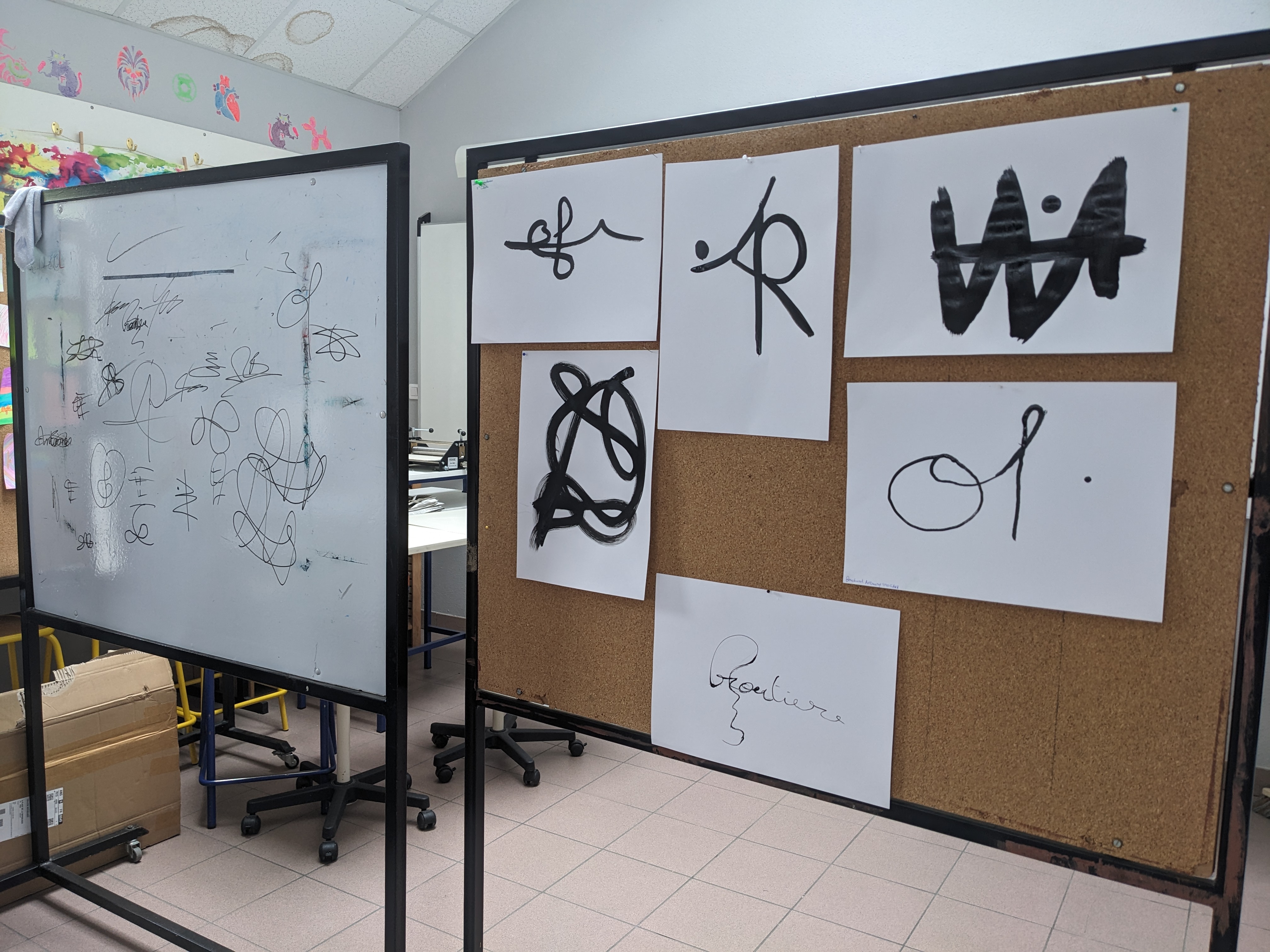 Amenés à définir une signature personnelle, les élèves vont s'entraîner un certain nombre de fois avant de maîtriser le geste pour le tracer en grand, à l'encre de Chine. Ils ont la possibilité d'essayer la plume, le pinceau rond, la brosse ou la calame.