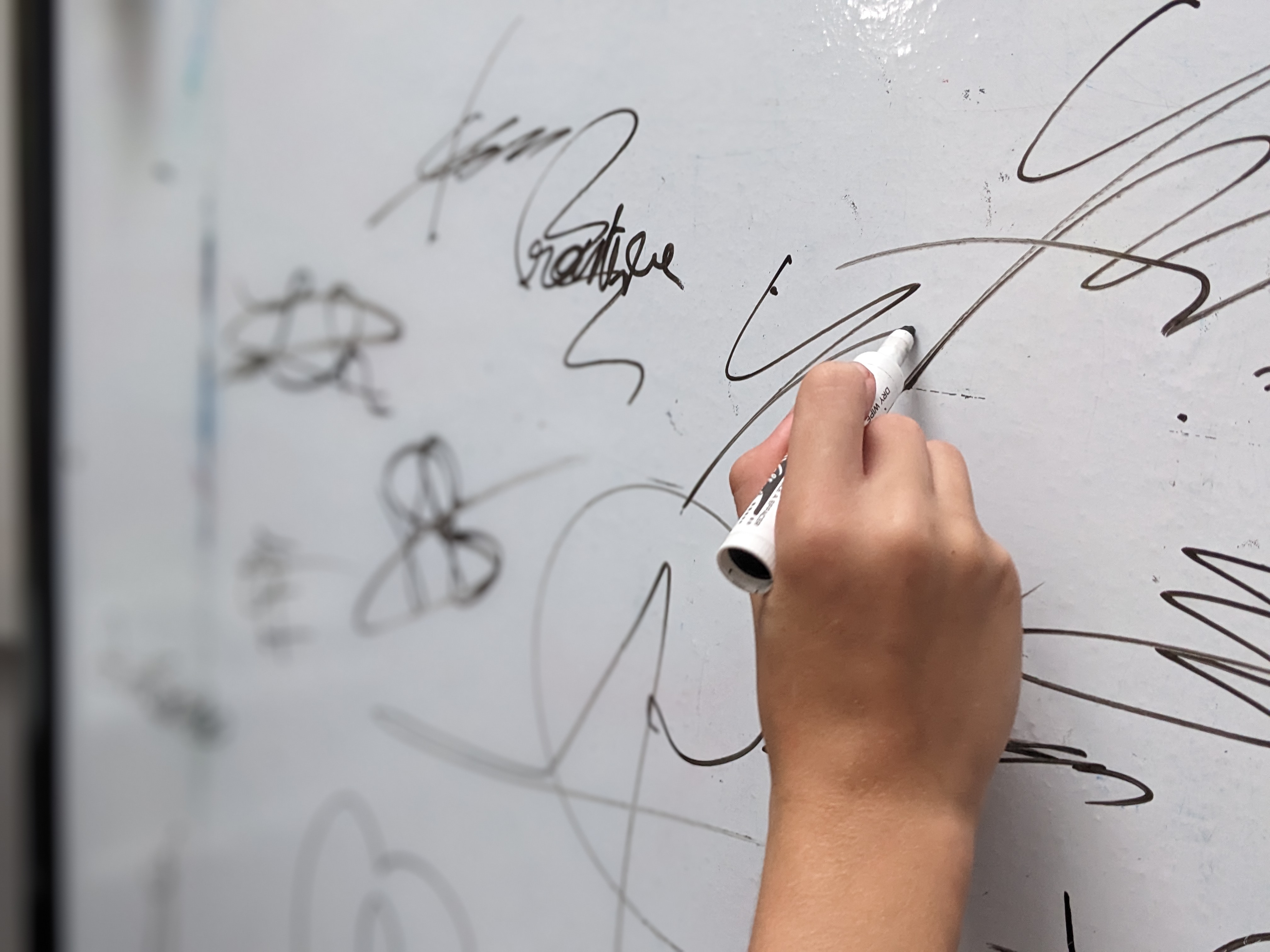 En passant prendre leurs supports et leurs outils pour l'étape suivante - les pots d'encre de Chine ayant été placés sur leurs tables pendant qu'ils cherchaient des signatures sur leurs cahiers, les élèves sont invités à tracer, sans modèle, leur signature sur un tableau blanc.