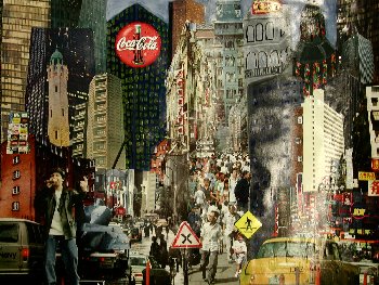 "Comme beaucoup voulaient faire une maquette, j'ai préféré être en deux dimensions. J'ai fait un photomontage sur un grand support papier, format raisin. J'ai recherché et découpé (dans des images de revues ou prises sur internet) des immeubles vus sous des angles variés avec un effet de contre-plongée. J'ai positionné les éléments en essayant de respecter des lignes de fuite et deux points de fuite extérieurs. Je voulais donner l'impression de grouillement et d'agitation comme dans les grandes villes américaines. J'ai dû superposer, combiner pour que ça fasse réaliste. J'ai mis des tas de signes de l'urbain: enseignes, pubs, panneaux de code de la route...J'ai peint le ciel pollué.