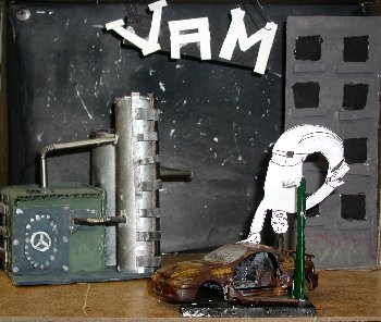 "Notre maquette est faite d'une base et d'un fond vertical. Le fond est travaillé comme un rideau de scène.On a peint à la gouache dans les tons gris pour faire triste. Un décor d'immeuble délabré est mis en décalage, pour faire un effet de profondeur (chaque fenêtre est percée). La base, c'est la scène. On a introduit de vrais objets miniatures : petite voiture calcinée, tuyauterie d'usine... Le chanteur "VAM" est au premier plan en train de danser. On a voulu que ça fasse banlieue".