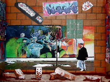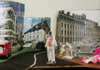 "Le décor est en trompe- l'oeil, installé dans une grande boîte. On a enlevé la face avant et le dessus. Les cotés et le fond on été peints avec un effet fausses briques, et on a collé des fausses affiches, des tags préparés avec des pastels à l'huile. Sur le devant, pour faire le premier plan, on a mis quelques briques de maquette, comme si c'était des gravas. A l'arrière, il y a un pauvre petit arbre prisonnier du béton. On a fait très attention à l'échelle, pour faire plus réaliste.