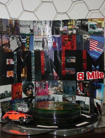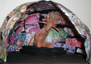 "j'ai mélangé deux et trois dimensions. C'est un peu une maquette, il y a une base peinte avec un genre de route qui tourne et disparaît derrière des faux immeubles. Une partie est peinte sur la base, la suite sur l'image. Les images de l'arrière sont là pour donner l'idée d'un quartier de la ville. J'ai ajouté des petites poubelles renversées, un mur cassé à droite. De l'autre côté, c'est un arrêt de bus. J'ai mis une miniature pour le bus. Le chanteur est une image découpée, recollée sur un support et positionnée dans la maquette, à la bonne place par rapport aux immeubles. Il ne devait pas avoir l'air géant ou nain!"