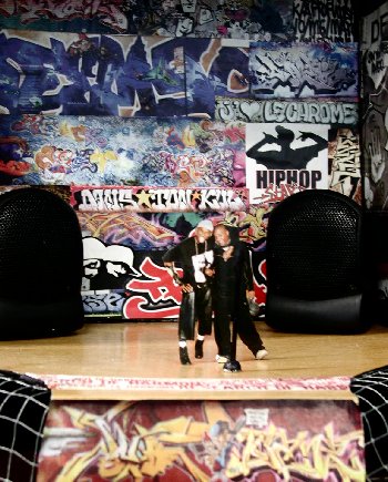 "nous, on a voulu vraiment comme une scène, avec les spectateurs qui seraient devant. C'est sur deux niveaux, car la scène doit être plus haute. Le mur de scène est couvert de tags, on a adapté les dimensions des images pour faire vrai. Le plateau est en bois. A part les énormes enceintes, il n'y a rien. Les rappeurs apparaissent. En fait, c'est Alban et moi . On a mis nos têtes sur les corps (avec photoshop). C'est notre rêve!".