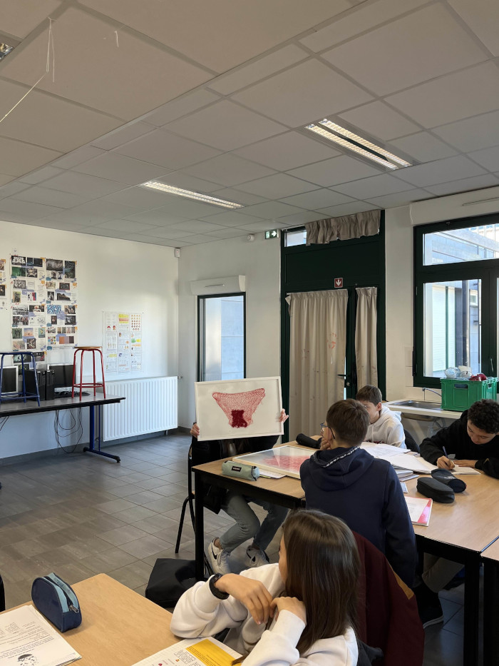 Concernant les arts plastiques, l’approche pratique s’est construite sur la mise en place d’une exposition croisée entre les portraits documentaires et des œuvres d’art. Pour cela, cinq œuvres ont été prêtées par l’artothèque d’Angers. Celles-ci ont été choisies pour créer un parcours cohérent dans la galerie questionnant la place de la femme dans la société en lien avec le parcours avenir puisque les portraits mettaient en avant des métiers scientifiques. Lorsque l’exposition a été finalisée, chaque classe du collège a pu la visiter accompagnée d’un professeur ou de la vie scolaire pour lire, se documenter, travailler sa réflexion sur le sujet et son regard sur les images exposées.