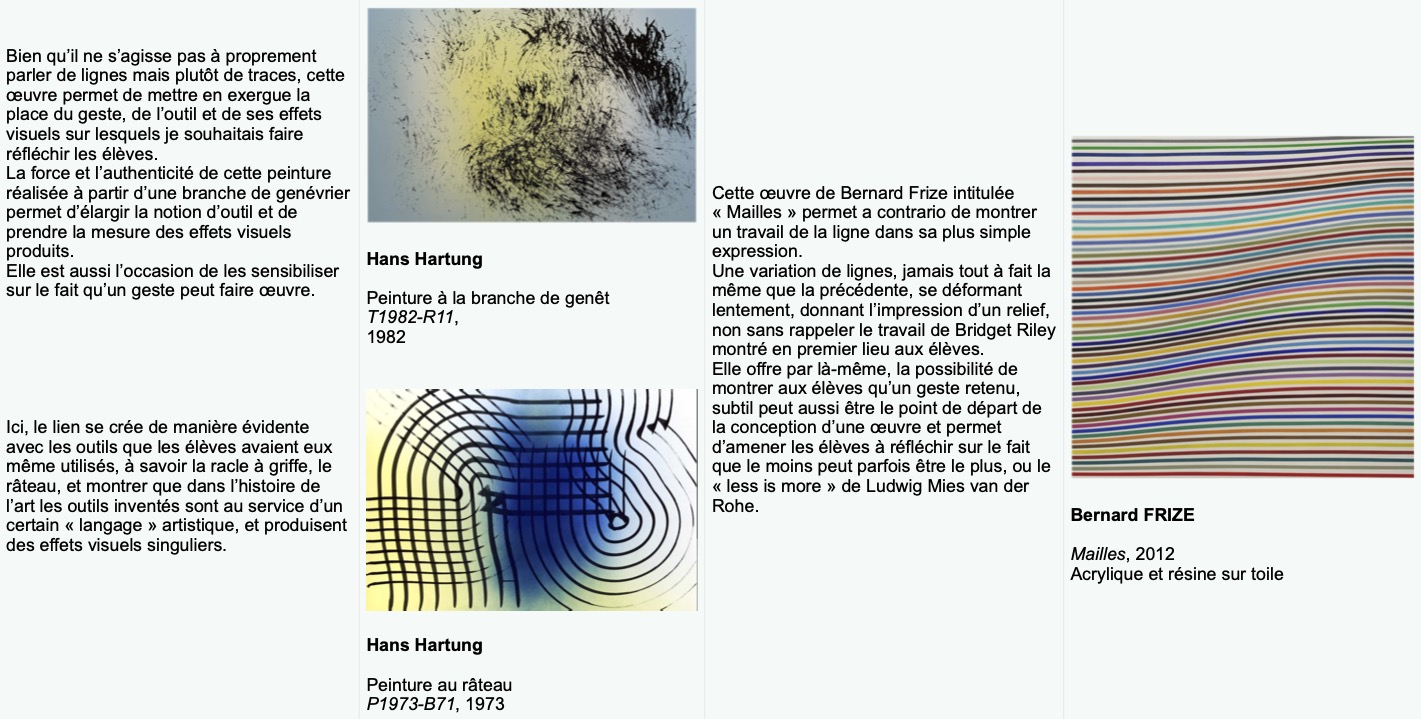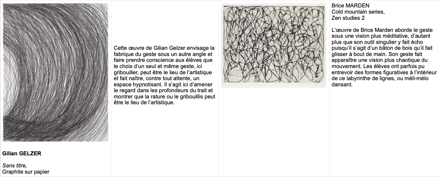 Il s’agit de faire découvrir aux élèves les démarches d’artistes qui ont envisagés le geste du dessin comme un mouvement pictural.