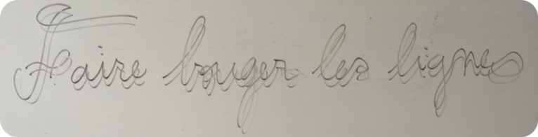 En vue d’introduire un travail exploratoire et réflexif, l’énoncé « Faire bouger les lignes » est indiqué au tableau. L’écriture manuscrite est volontairement énigmatique et doublée grâce à deux crayons associés.