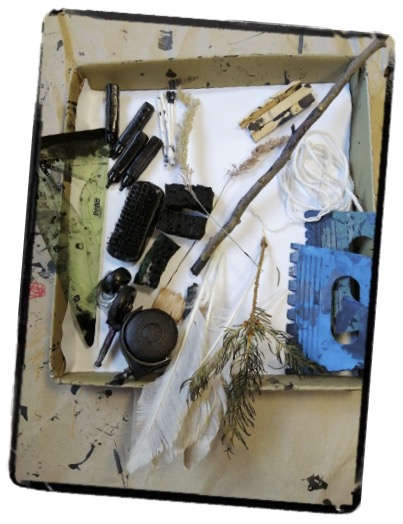 Divers outils sont mis à disposition dans des boites usuelles sur les tables : morceau d’éponge, rouleau en mousse, morceau de bois, branche de sapin, plume d’oiseau, coton tige, brosse à ongles, règle, racle à griffes, cordon, roulette, moitié de pince à linge en bois.