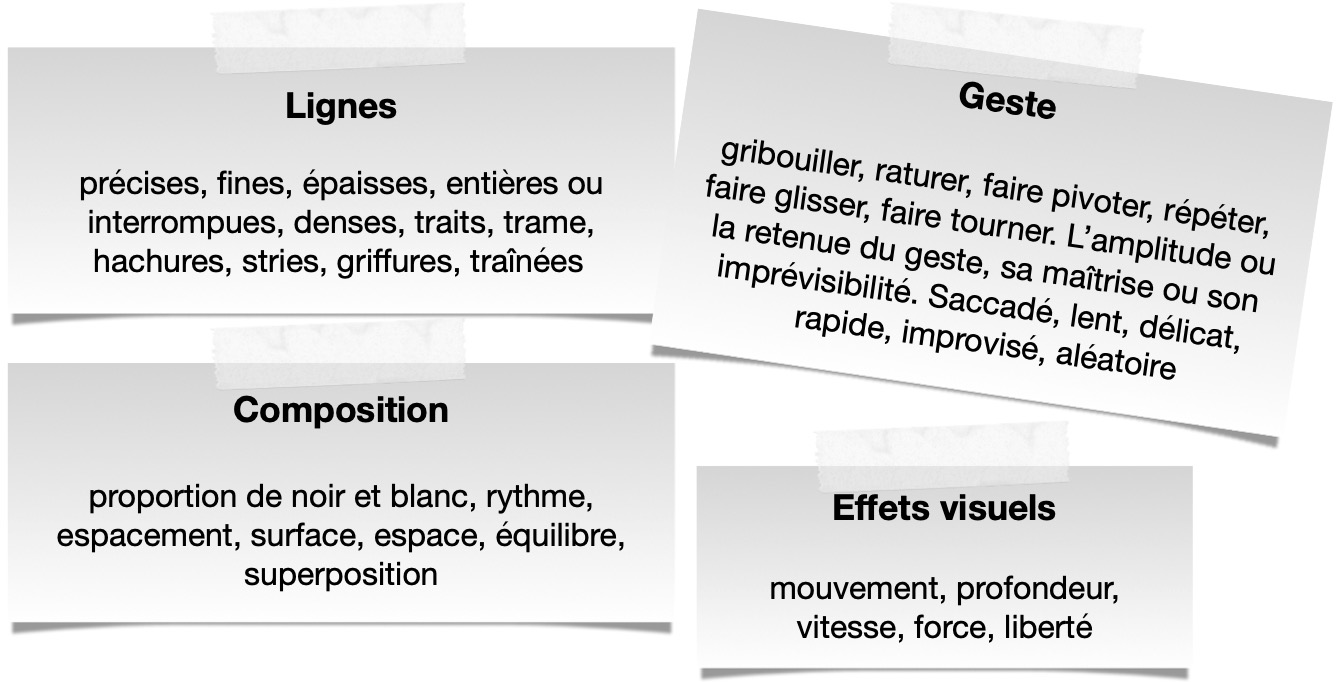 La verbalisation aborde des différents types d'approche de la ligne, du geste, de la composition et des effets produits.