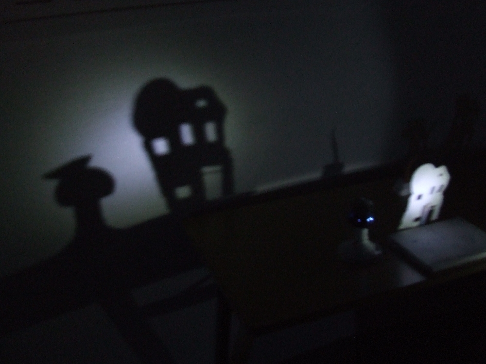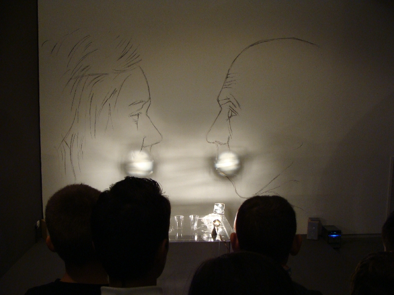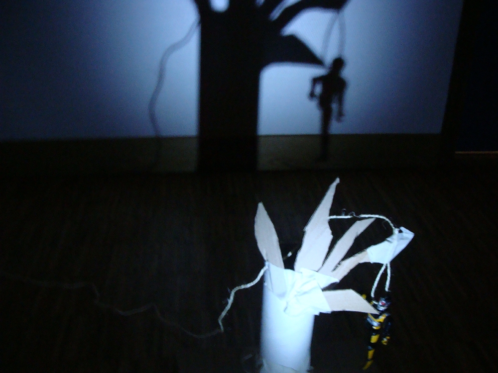 La deuxième séance se passe dans une grande salle polyvalente permettant l'obscurité complète et entourées de murs blancs. Les élèves travaillent sur leurs petites installations. La consigne leur est donnée de prendre au moins trois photos (l'ensemble de l'installation, l'image créée et enfin le dispositif permettant la création de l'image seul).