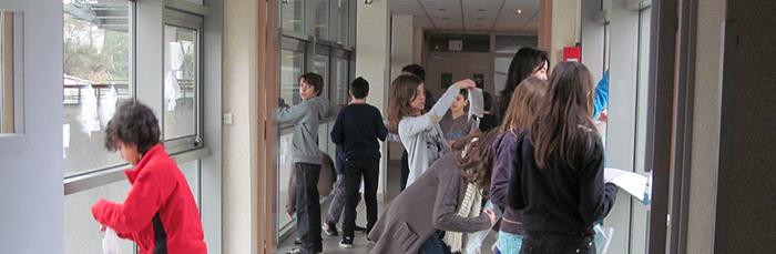Les élèves choisissent dans un lieu de passage, en partie vitré, comment accrocher leur travail, en fonction de ses caractéristiques mais également de ce qui l'entoure (lieu, autres réalisations), modifiant ainsi la façon dont il est perçu mais aussi le lieu lui-même.