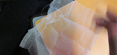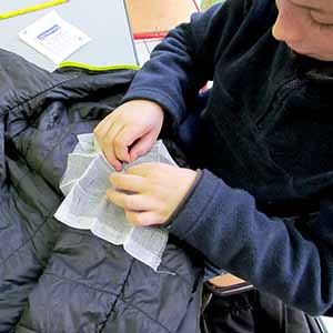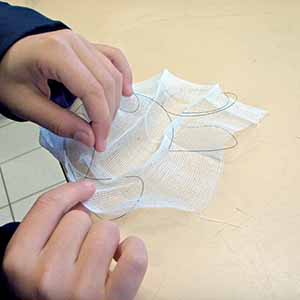 Références au programme : « Par son caractère concret, l'objet renvoie à l'expérience sensible des élèves ». En choisissant comme objet un morceau de compresse de gaze médicale, l'élève se questionnera sur les qualités physiques de cet objet (doux, léger, transparent, troué) et sur de possibles exploitations plastiques. |