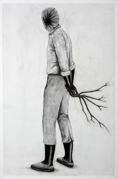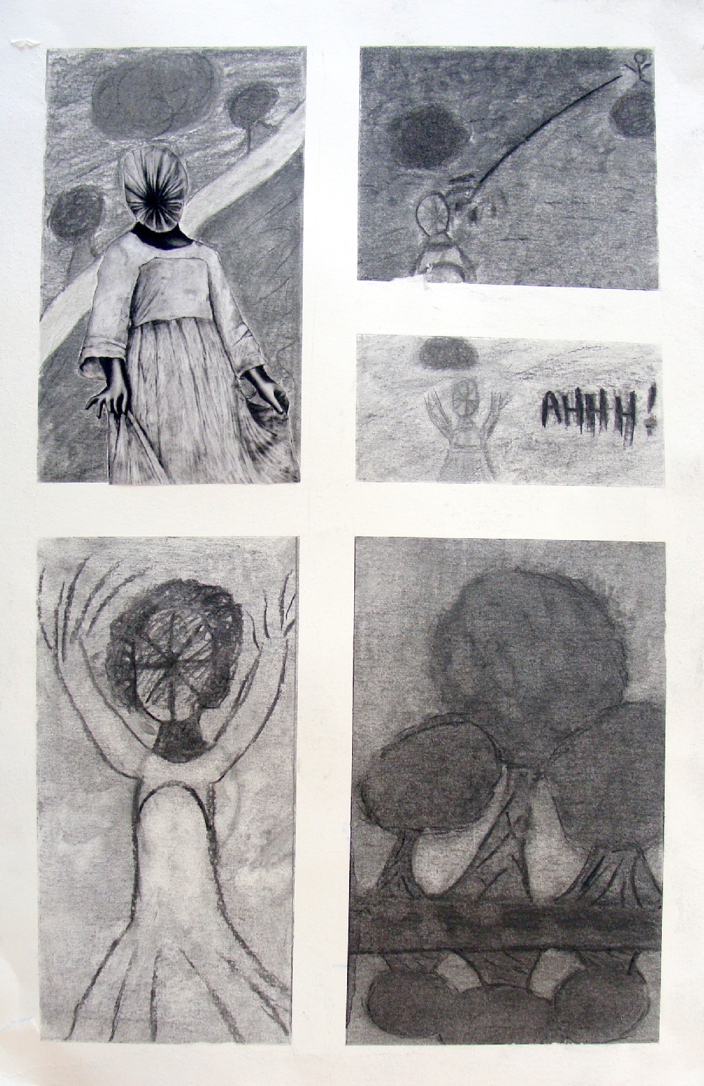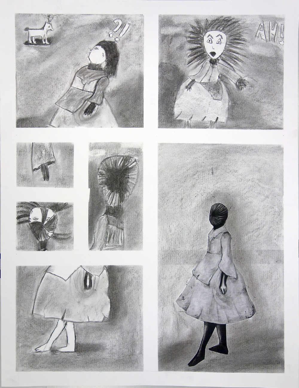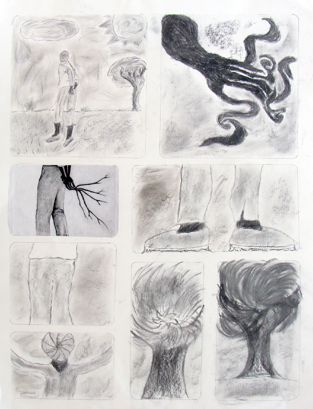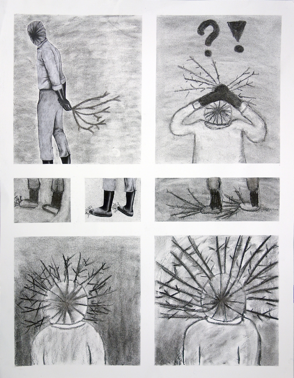 Récit d'une métamorphose Créer une planche de bande dessinée entre 4 et 8 vignettes qui intégrera un des personnages de la série "Les Héritiers", grands dessins réalisés en 2011 par Pierrick NAUD présentés dans la galerie. Travail individuel - fusain - 4 séances |