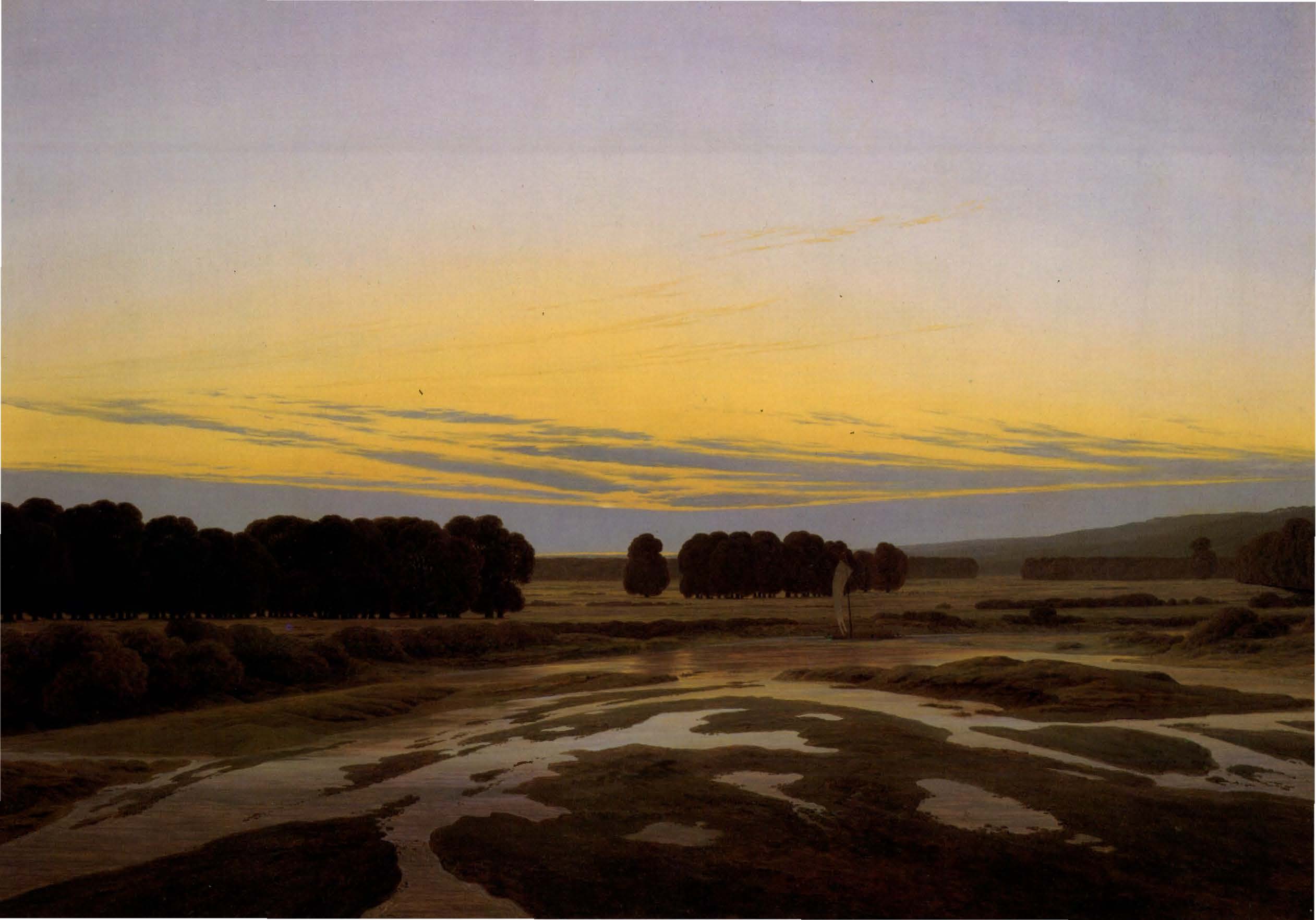 Le terme "étendue spatiale" évoque l'idée de quantité d'espace représenté. Pour évoquer un espace démesuré, ma première référence instinctive est La grande réserve de Caspar David Friedrich. "Le peintre ne doit pas peindre seulement ce qu'il voit en face de lui, mais aussi ce qu'il voit en lui."
