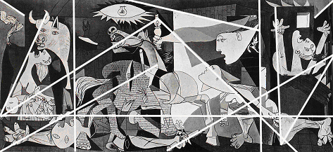 En début de cours, projection de «Guernica», accompagnée de quelques commentaires oraux pour situer le contexte dans lequel ce tableau a vu le jour. Les élèves travaillent à partir de l'œuvre projetée.