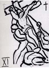 Dans ce tableau, l'espace est incertain, les corps sont distendus, cassés par l'éclatement des plans, emboîtés autant que disloqués. Mais ce chaos apparent est contrebalancé par la hiérarchisation apportée par la gradation des gris et les forts contrastes noir/blanc qui apportent à la composition sa cohérence. L'œuvre est tendue entre destruction et construction.