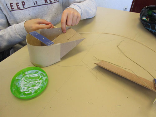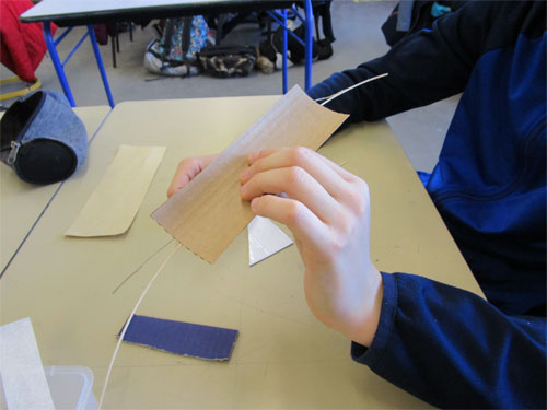 Les élèves sont placés, en ilot de quatre, en situation de recherche, de réflexion et d’expérimentation. Ils associent et assemblent les pièces avec une certaine autonomie. Ils percent, nouent, collent, superposent, emboitent les éléments tout en cherchant la ressemblance avec une guitare. Ils essaient de consolider leur construction via la manipulation des matériaux.
