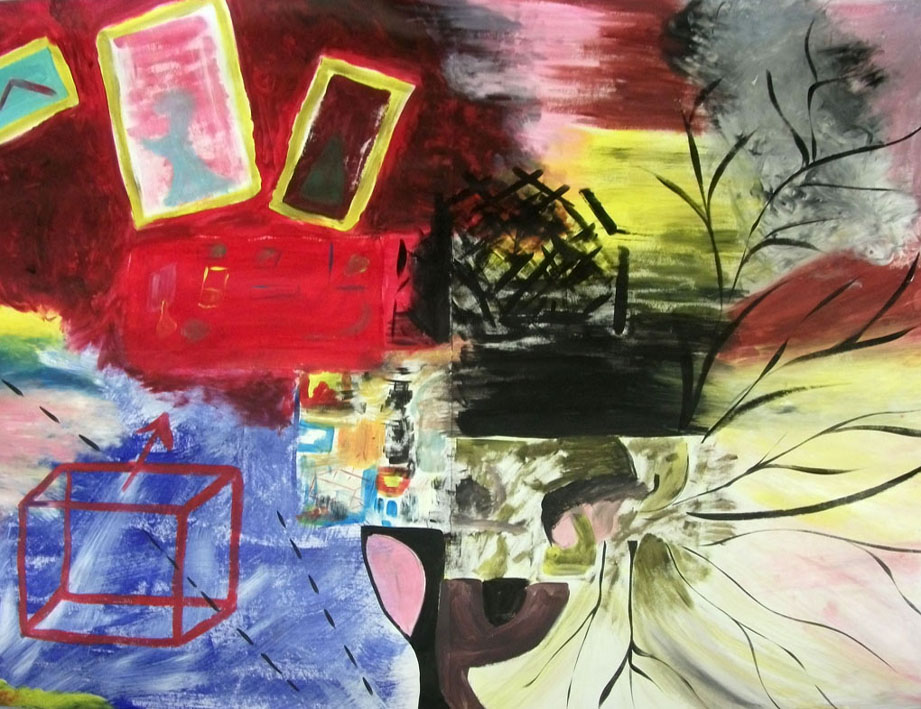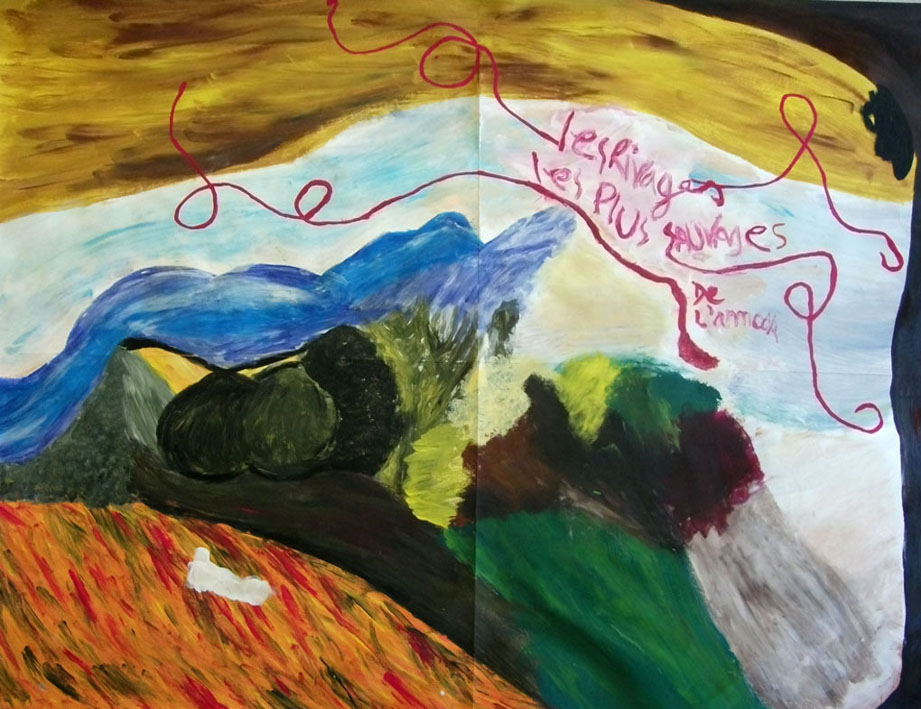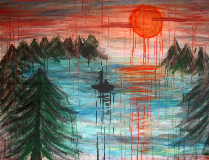 « J'ai réalisé une sorte de zoom sur le paysage de départ pour mieux représenter avec précision les contrastes (reflet des arbres sur le lac, propagation de la lumière du soleil dans le ciel). Je suis partie avec l'idée d'alchimie des couleurs : l'orange, le bleu et le vert s'étendent sur toute la surface grâce aux coups de pinceaux horizontaux qui amalgament les différents éléments. Dans un deuxième temps, le fait de peindre à la verticale m'a donné la possibilité de laisser apparaître les dégoulinures de la peinture. J'ai tout d'abord laissé la peinture à l'eau couler naturellement puis j'ai redessiné les coulures au pinceau afin qu'elles soient davantage prononcées. Le soleil semble par exemple fondre de chaleur. Cela donne l'impression que le paysage va s'effondrer. De plus, rendre la peinture qui coule visible rappelle au spectateur qu'il s'agit d'une peinture et donc d'un monde imaginaire qui peut se déconstruire de la même manière qu'il s'est construit. » Léone