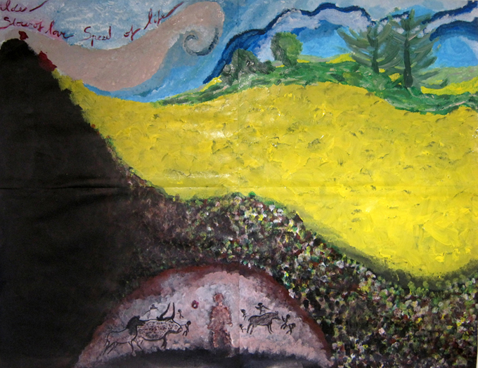 « J'ai suivi la technique de Mathilde en utilisant l'empâtement et en essayant de garder le même geste. Par contre, j'ai intégré une grotte en bas où le personnage contemple les animaux peints. J'ai voulu que se confondent le personnage qui regarde et celui qui est peint. » Laly
