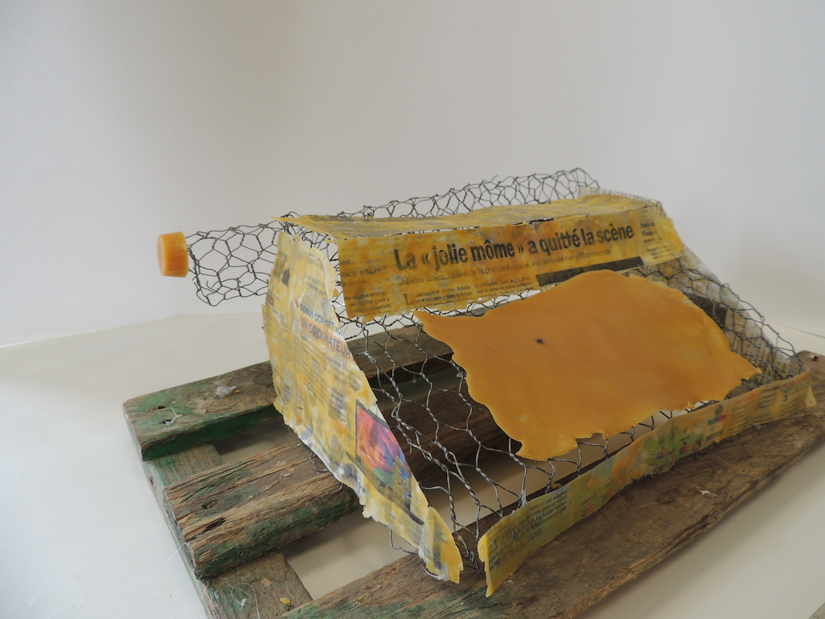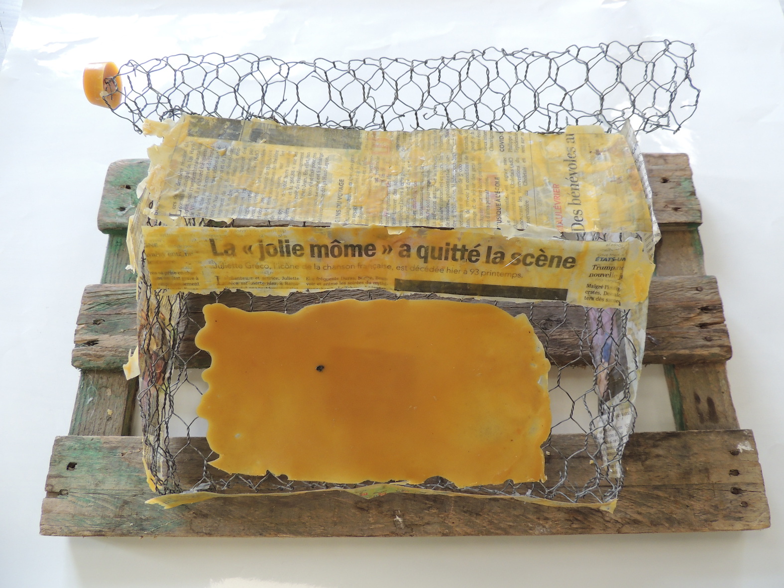 La cire d'abeille est pour moi source de sensibilité et de fragilité et met ainsi la machine en valeur en l'enveloppant d'une seconde peau jaunie et donc vieillie, et l'imprègne d'une douce odeur. J'ai recouvert des bouts de papiers journaux prédécoupés de cette cire d'abeille pour travailler un jeu de texture et de superposition. Le journal illustre les traces de notre quotidien et du même coup, de notre histoire. Toutes ces lettre réparties de part et d'autre sur cette structure expliquent le choix de laisser vierge la plaque de cire qui matérialise le clavier."