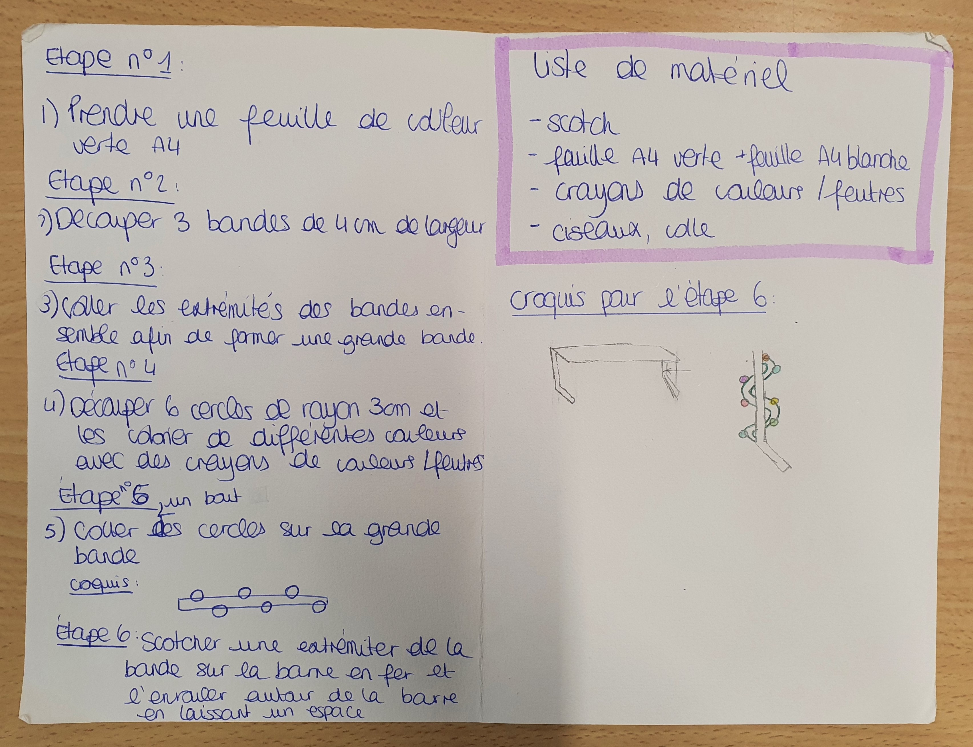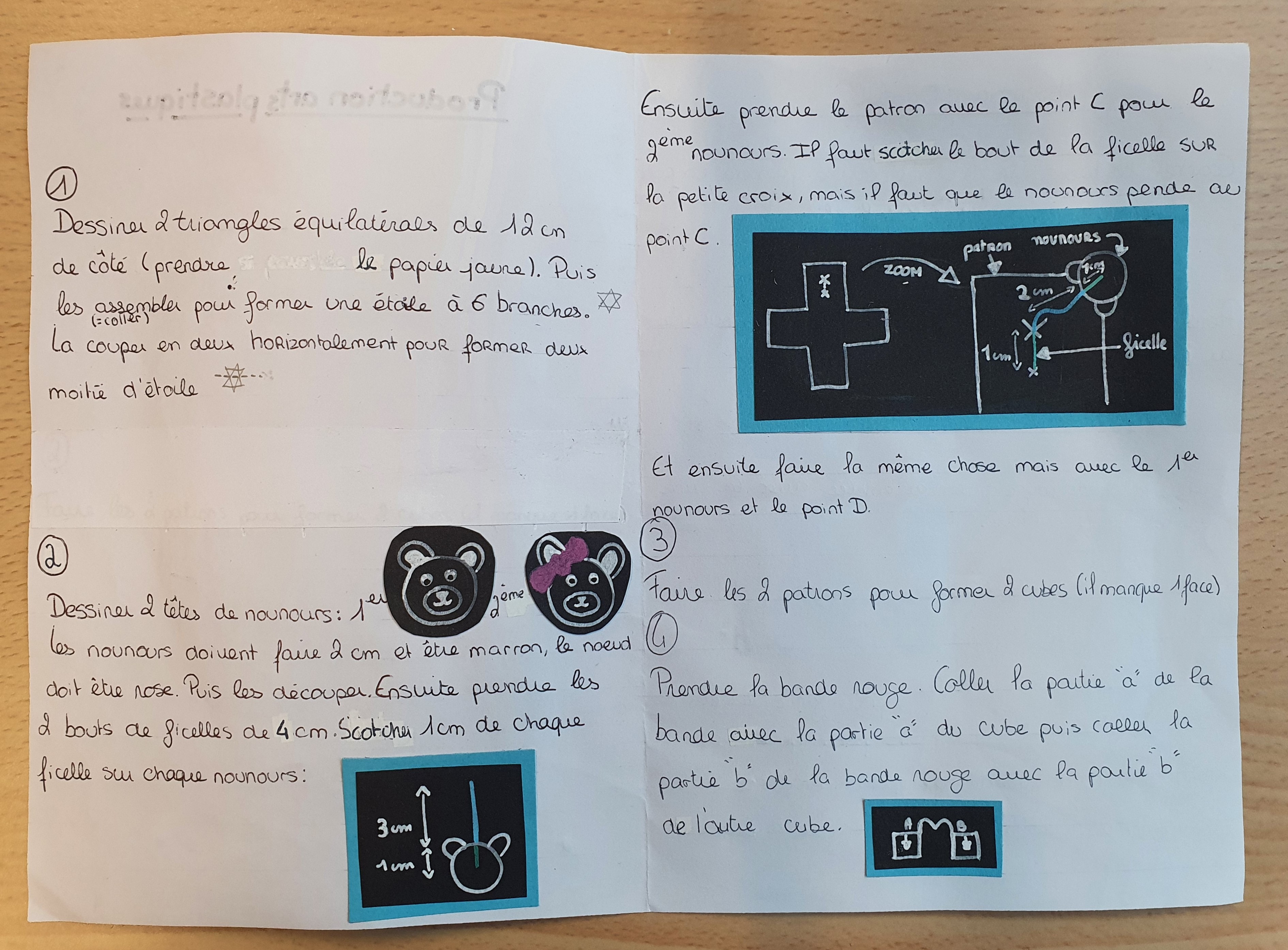 Les instructions données devront être suffisamment précises pour qu'un tiers puisse les réaliser. D'autre part, devront être anticipés les matériaux mis à disposition par les élèves pour que leurs camarades exécutent leur réalisation. Enfin, il faudra prendre en compte le temps de pratique, qui ne devra pas excéder une heure.
