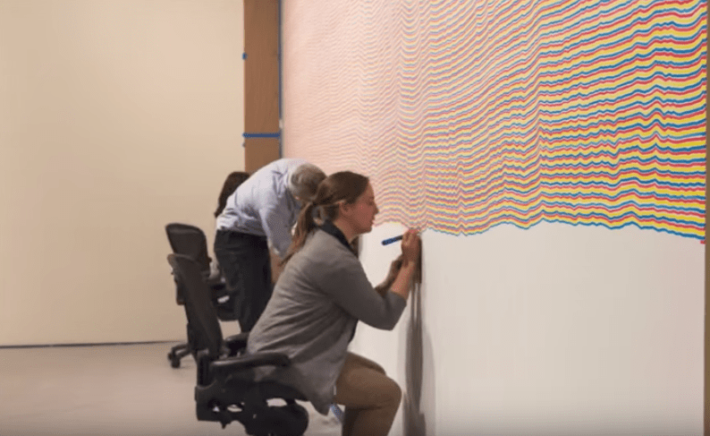 En suivant les instructions écrites laissées par l'artiste en 1995, quarante-neuf étudiants de l'Université du Texas ont passé onze jours à créer une version de Wall Drawing 797au Blanton Museum of Art en 2014.