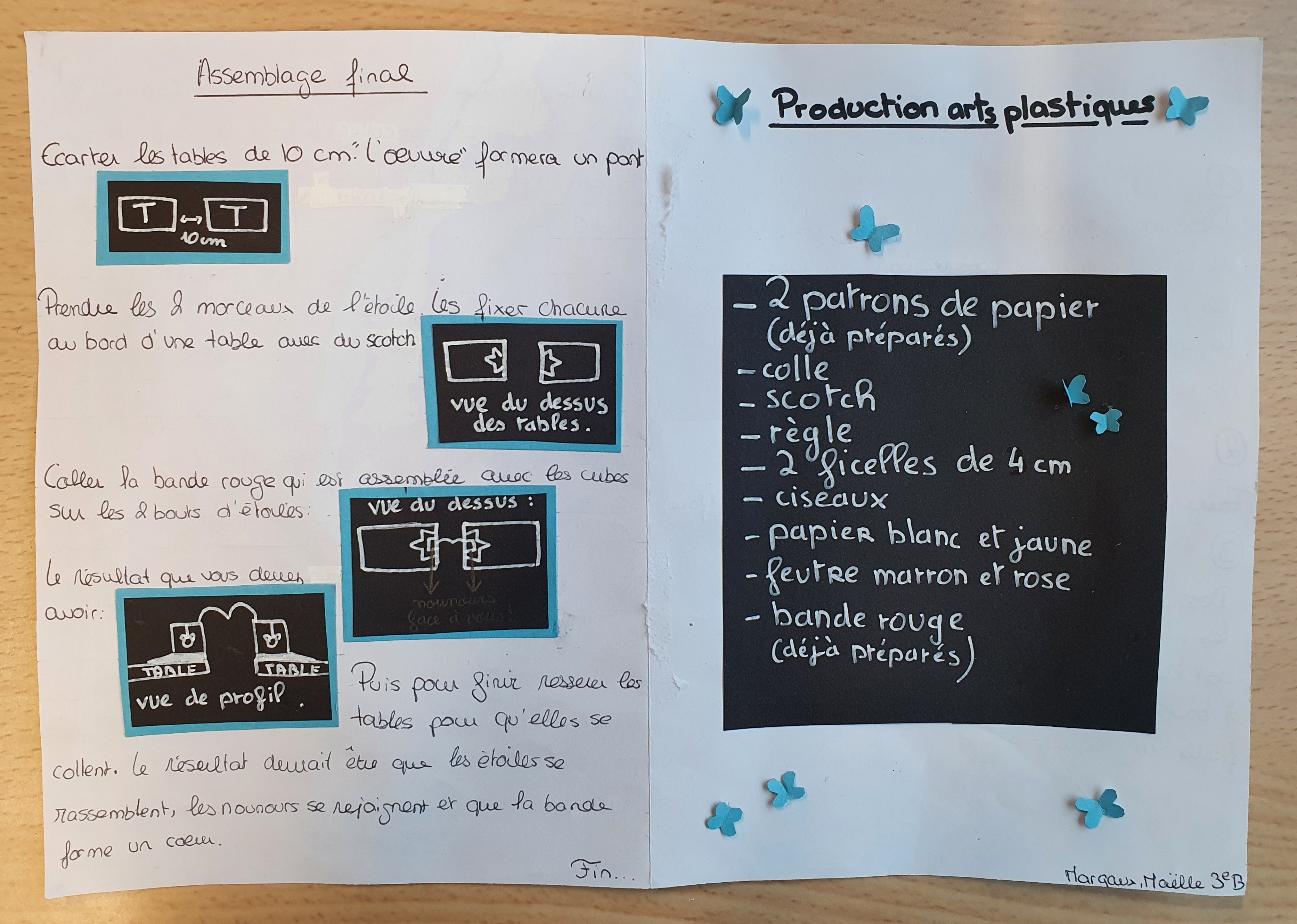 Les élèves suivent les consignes établies par notice et peuvent être amenés à réajuster ou compléter certaines d'entre elles, si nécessaire, afin de pouvoir finaliser la production. Des photographies peuvent être prises pour garder une trace d'une installation. Les protocoles sont accrochés près des productions. Un échange peut permettre de revenir sur les choix effectués par les élèves: support, format, présence de croquis, choix des textes, des matériaux... Existe-t-il un décalage, une interprétation des consignes? Cet écart est-il gênant ou intéressant?
